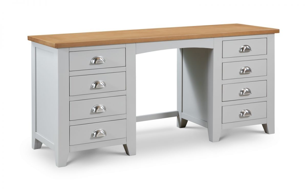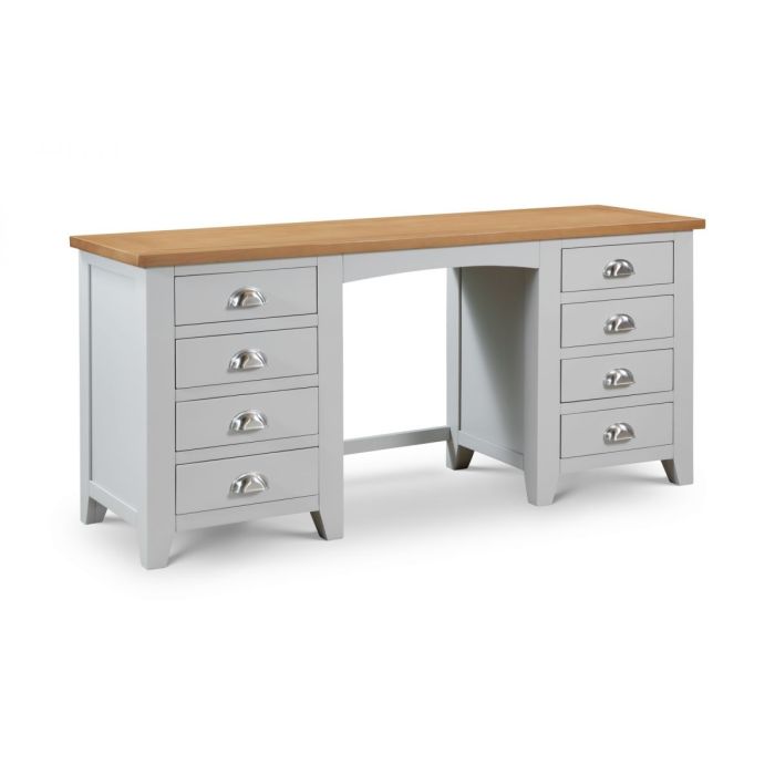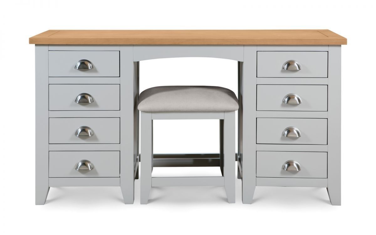 Finished in a elephant grey lacquer, the Richmond bedroom range is a timeless, elegant design suitable for a wide range of decor. Constructed from white oak and oak veneers, this lacquered bedroom range brings a modern twist on a traditional construction. Suitable for those with set morning routines, this twin pedestal dressing table offers a spacious surface as well as 8 drawers for your cosmetics.