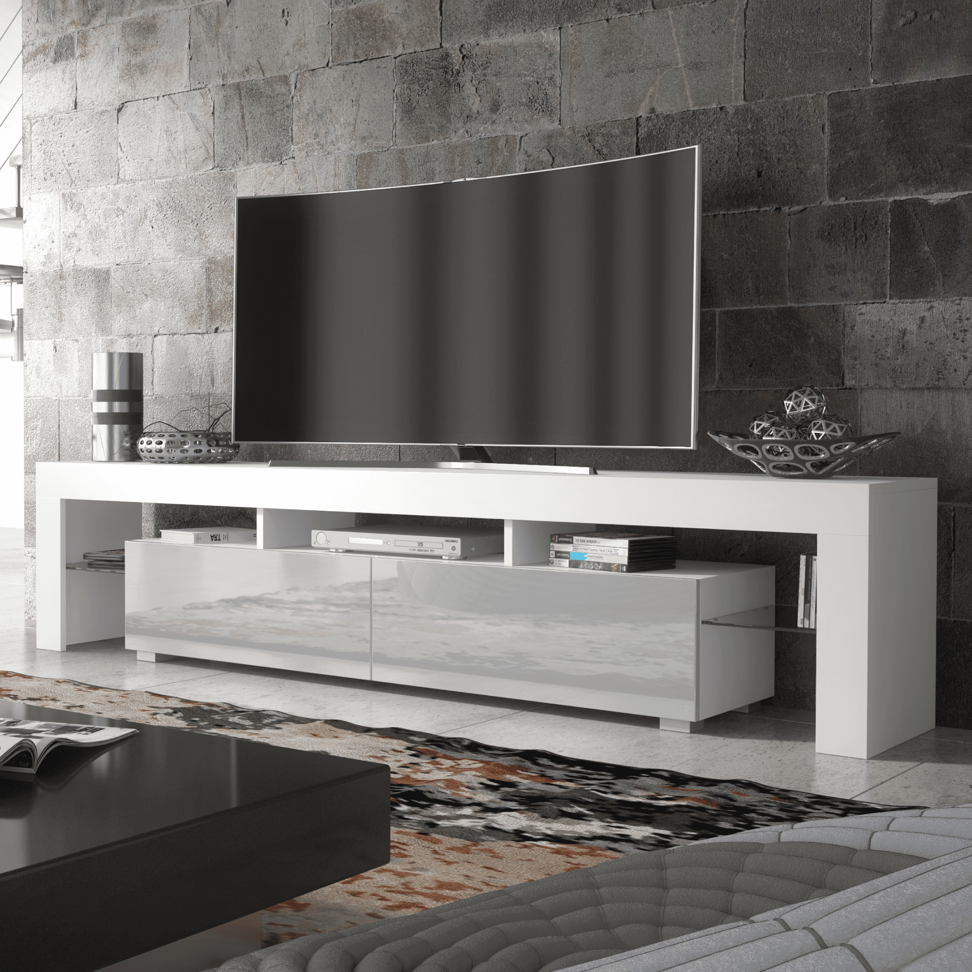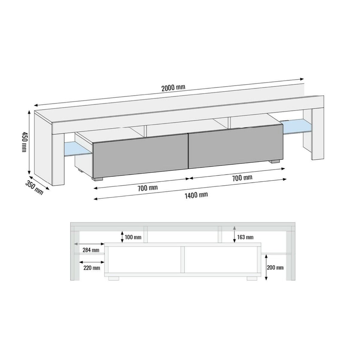 The RIDGE TV Unit transforms your living room into a spacious and elegant entertainment hub, serving as a stunning centerpiece for any contemporary interior. Measuring 200cm (W) x 45cm (H) x 35cm (D), this generously sized cabinet combines style and functionality, making it the perfect fit for larger spaces. The unit features a sleek matte body paired with high-gloss doors, creating a clean and modern aesthetic. Please note: the Dark Oak with Black version features matte black doors, providing a unique and understated alternative to the glossy finishes available in other combinations. Crafted from durable 16mm chipboard and MDF, the RIDGE TV Unit is built to last and thoughtfully includes easy cable access to ensure a clean and organized entertainment setup. Available in White & Gloss Doors, White & Grey Gloss Doors, Black & Gloss Doors, Walnut & Black Gloss Doors, Oak & White Gloss Doors, Dark Oak & Black Matt Doors, and Dark Grey & Gloss Doors, this versatile unit is designed to enhance any modern living space.