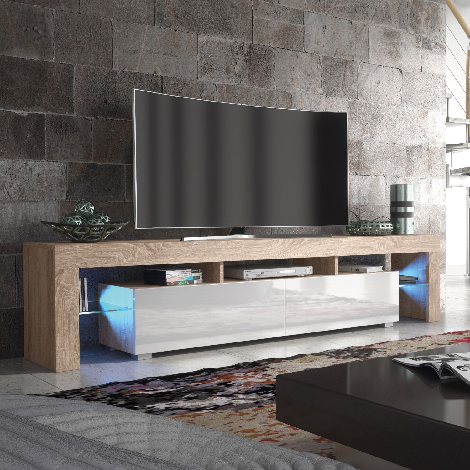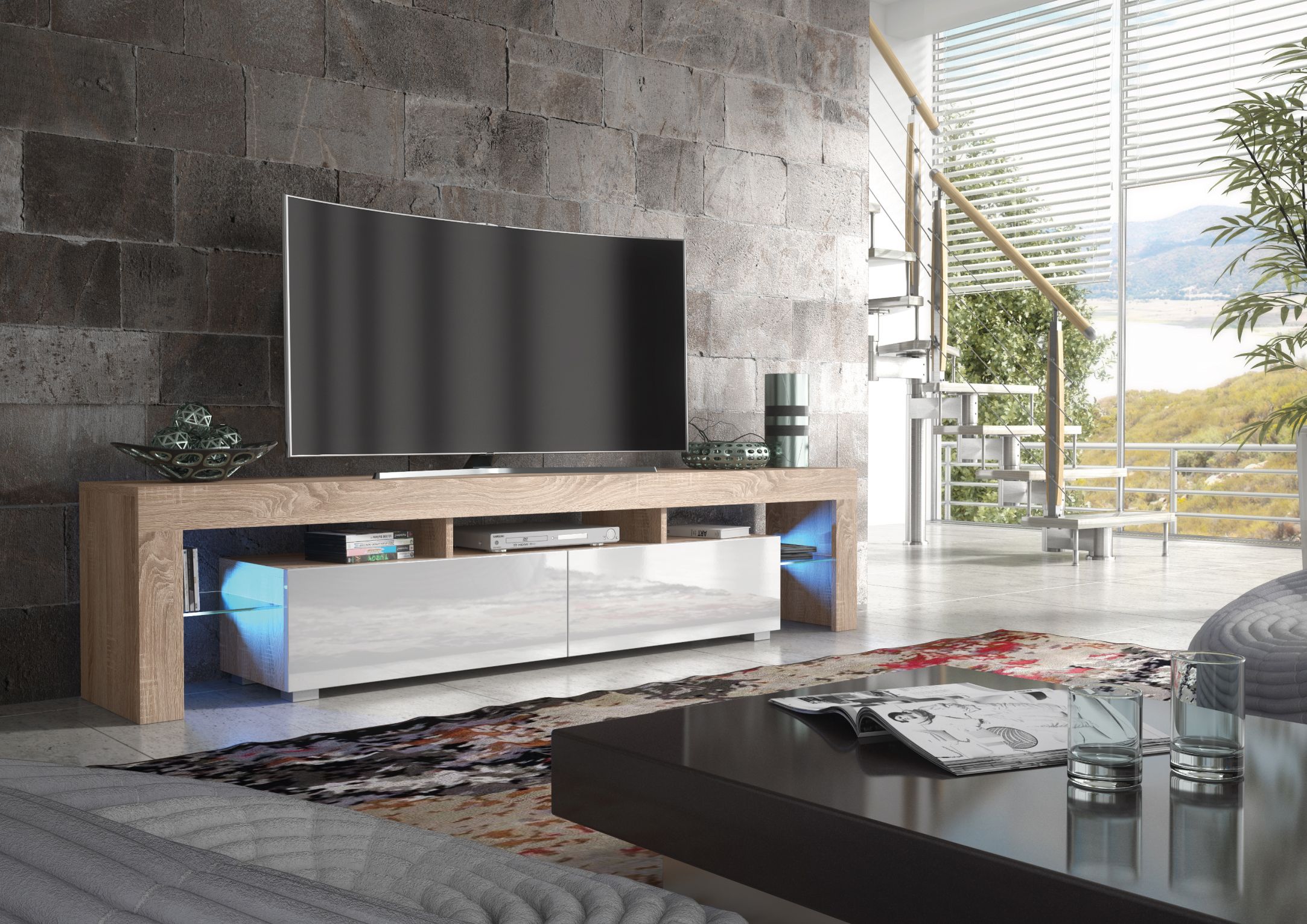The RIDGE TV Unit transforms your living room into a spacious and elegant entertainment hub, serving as a stunning centerpiece for any contemporary interior. Measuring 200cm (W) x 45cm (H) x 35cm (D), this generously sized cabinet combines style and functionality, making it the perfect fit for larger spaces. The unit features a sleek matte body paired with high-gloss doors, creating a clean and modern aesthetic. Please note: the Dark Oak with Black version features matte black doors, providing a unique and understated alternative to the glossy finishes available in other combinations. Crafted from durable 16mm chipboard and MDF, the RIDGE TV Unit is built to last and thoughtfully includes easy cable access to ensure a clean and organized entertainment setup. Available in White & Gloss Doors, White & Grey Gloss Doors, Black & Gloss Doors, Walnut & Black Gloss Doors, Oak & White Gloss Doors, Dark Oak & Black Matt Doors, and Dark Grey & Gloss Doors, this versatile unit is designed to enhance any modern living space.