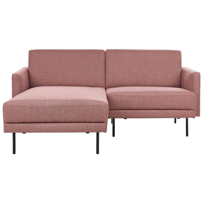 Embrace the essence of modern living with this outstanding right-hand corner sofa. Upholstered in luxurious comfort and supported by sleek black metal legs, it's a minimalistic masterpiece. The product can seat up to 2 people, so you can relax with your loved one in comfort. Elevate your space and revel in the perfect blend of form and function. Details: Color: Pink, Brown, Black. Main material: Polyester. Additional material: Eucalyptus Wood, Plywood, Viscose, Nylon, Iron. Material Composition: 88% Polyester, 9% Viscose, 3% Nylon Weight: 51 Capacity: 2 People Assembly: Full Assembly Required Wood type: Eucalyptus grandis Wood Origin: China Cushions Dimensions: 88x45x11 Legs Height: 20 Padding Thickness: 17 Seat Height: 45