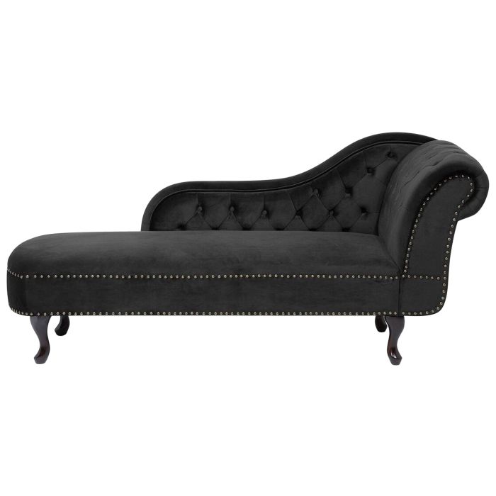 The marvellous chaise lounge is an elegant piece to add to your interior, especially suitable for living rooms and halls. Upholstered with velvet, it is sturdy and pleasant to touch. The chaise lounge is additionally embellished with tufted buttons and nailhead trim. A combination of engineered wood and hardwood make the frame and legs exceptionally durable, warranting great stability and longevity. Details: Color: Black, Dark Wood. Main material: Velvet. Additional material: Larch Wood, Plywood. Material Composition: 100% Polyester Weight: 34 Assembly: Full Assembly Required Wood type: Larix gmelinii (Rupr.) Wood Origin: China Weight Capacity: 180 Legs Height: 20 Padding Thickness: 20 Seat Height: 43