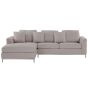 The elegant corner sofa comes in a modern design that complements any contemporary interior. The exceptionally long chaise, situated on the right from the perspective of the sitting person, offers ample room for relaxation. All parts are made of polyester linen. Its stable, chrome-plated legs and add a touch of modern to the classic design. The additional cushions feature a removable cover that translates to easy cleaning without a worry for stains. Details: Color: Beige, Silver. Main material: Polyester. Additional material: Metal, Eucalyptus Wood. Material Composition: 100% Polyester Weight: 93 Capacity: 4 People Assembly: Partial Assembly Required Wood type: Eucalypteae Wood Origin: China Cushions Dimensions: 40x40 Legs Height: 12 Padding Thickness: 15 Seat Height: 46