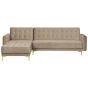 This large corner sofa is an ideal anchor piece for your living room, inviting and homely. Versatile in design, the sofa can be turned into a comfortable bed for two thanks to the adjustable backrest. Additionally, the chaise can be positioned on either side to suit your needs. Fully upholstered in high-quality beige fabric with elegant tufting, this corner sofa offers both functionality and timeless style that will highlight the best of any modern home. The whole piece is kept stable thanks to metal legs. Details: Color: Beige, Gold. Main material: Velvet. Additional material: Plywood, Metal. Material Composition: 100% Polyester Weight: 80 Capacity: 4 People Assembly: Partial Assembly Required Wood Origin: China Legs Height: 13 Padding Thickness: 20 Seat Height: 41 Sleeping Surface: 241x108