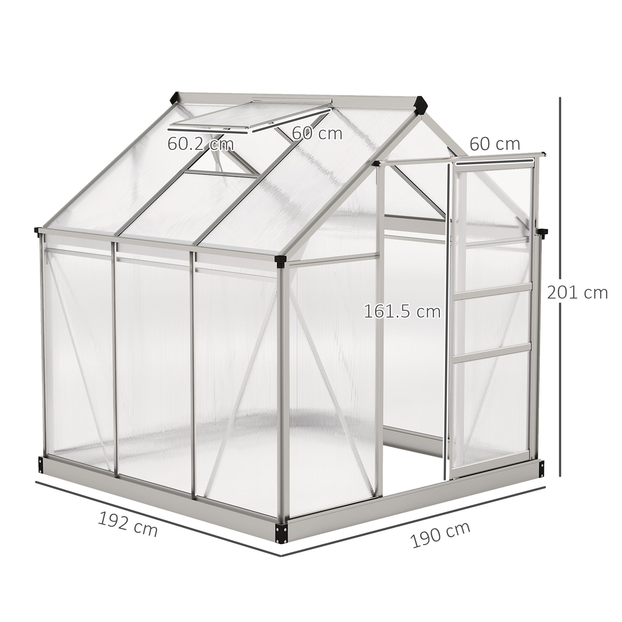 Overall Dimension: 190L x 192W x 201H cm, Window Size: 60.2L x 60W cm, Door Size: 60L x 161.5H cm, PC Board Thickness: 4 mm