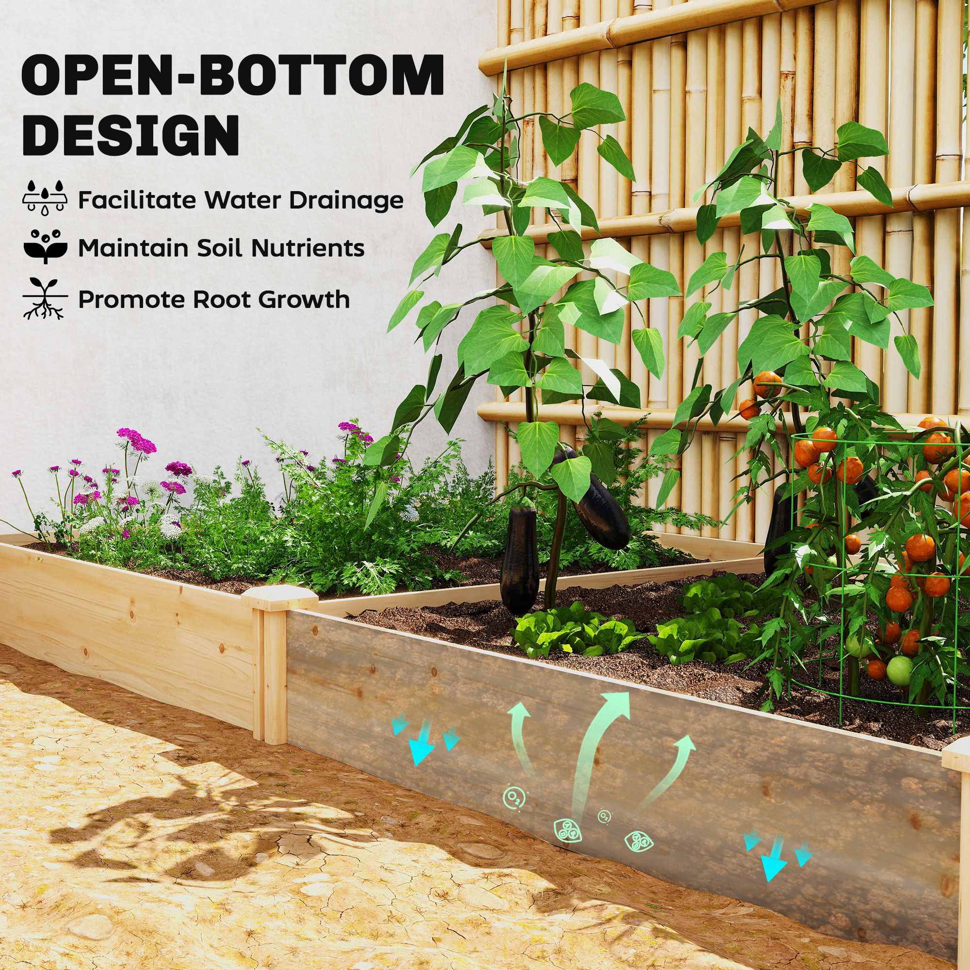 Large planter box with divider: our elevated planter box features a divider, creating two distinct planting compartments - great for various plant types, such as vegetables, flowers, fruits and herbs. Open-ended base: engineered with an open-bottom design for enhanced drainage - no more worrying about water buildup! this wooden raised planter ensures your plants get the essential nutrients and moisture they need for strong, healthy root growth. Natural wood construction: crafted from solid wood and finished with a varnish surface, this outdoor planter resists deformation and cracking and is suitable for diy painting to match your garden decor. Easy to assemble: the slotted leg design allows you to set up your raised garden bed without complicated tools, saving time and effort while getting your garden ready fast. Overall dimensions: 235 L x 121 W x 26 H cm. Planting area size: 112. 5 W x 23 H cm (each planter box)