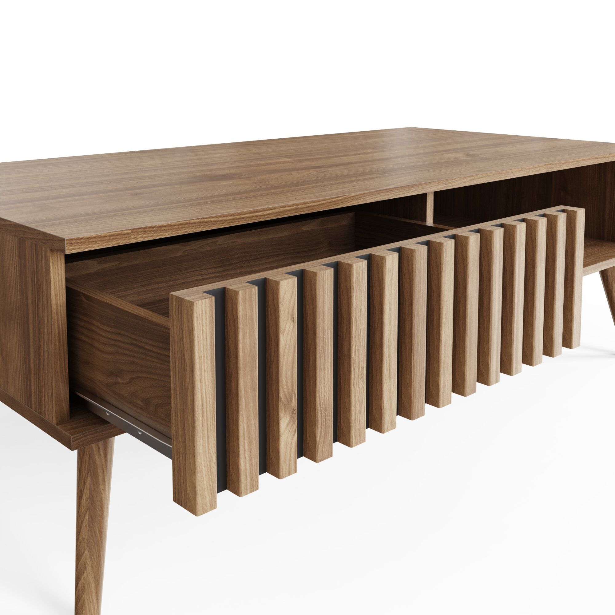 The ROANELL Coffee Table effortlessly combines modern sophistication with functional design, making it a centerpiece in any contemporary living room. Featuring a smooth oak-effect finish, sleek tapered legs, and eye-catching slat detailing, this table exudes mid-century modern charm. The addition of a discreet grey door at the back of the drawers provides a stylish touch while offering hidden storage for your essentials. Designed with practicality in mind, the open shelf is perfect for displaying books, magazines, or decorative accents, while the enclosed storage space keeps clutter out of sight. Built to last, the sturdy construction ensures durability for everyday use, maintaining its elegant appeal over time. With a spacious surface ideal for serving drinks or showcasing décor, this coffee table is as versatile as it is visually appealing. Shelving is non-adjustable.