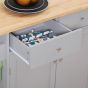 This prep & serving cart well fits limited spaces and can be moved to wherever you need it. 2 pull-out drawers, a double-door cabinet and a towel rack provide lots of space for supplies and accessories. Easy-roll wheels allow you to move wherever it is needed most. Solid rubberwood tabletop and MDF panels ensure sturdy construction and easy cleaning.