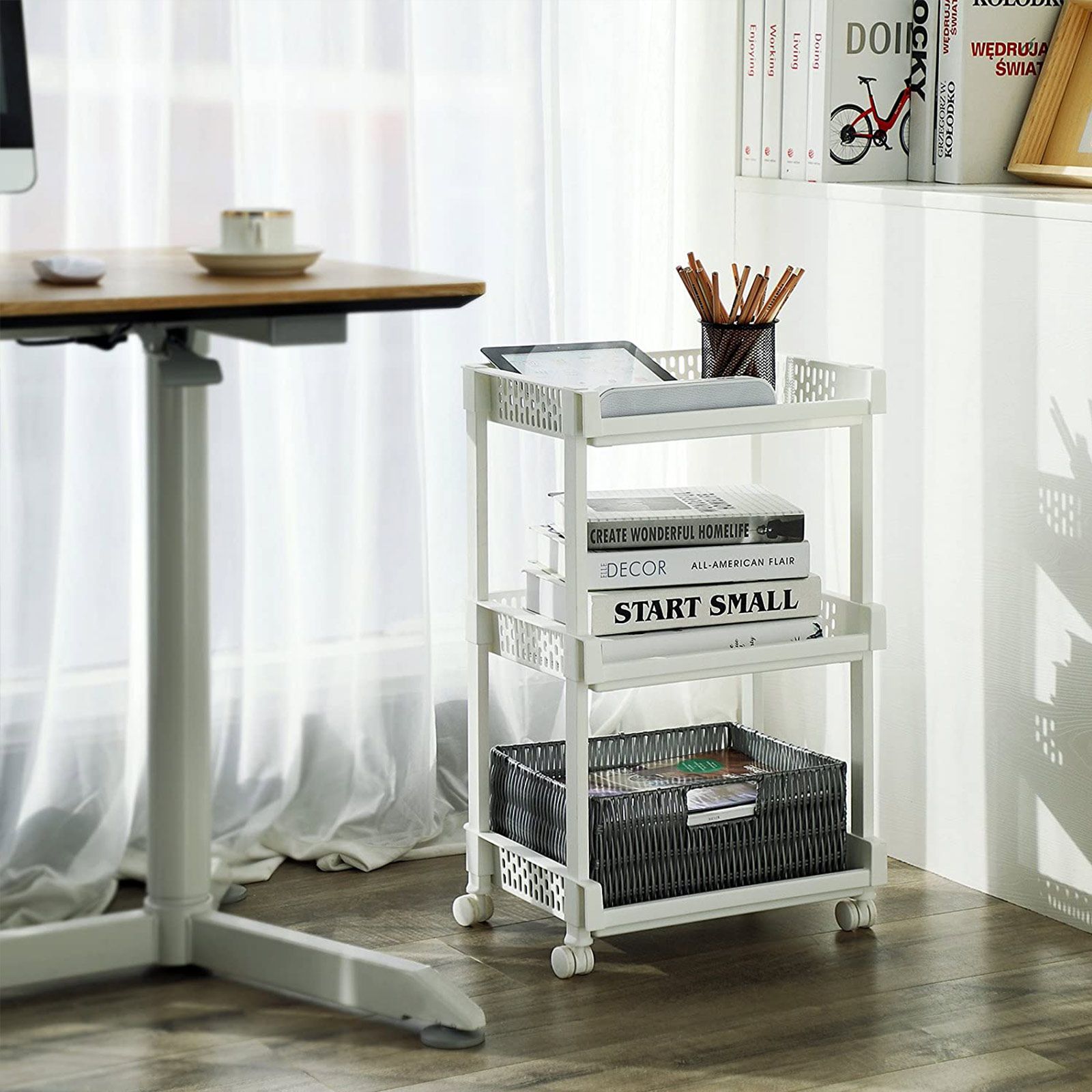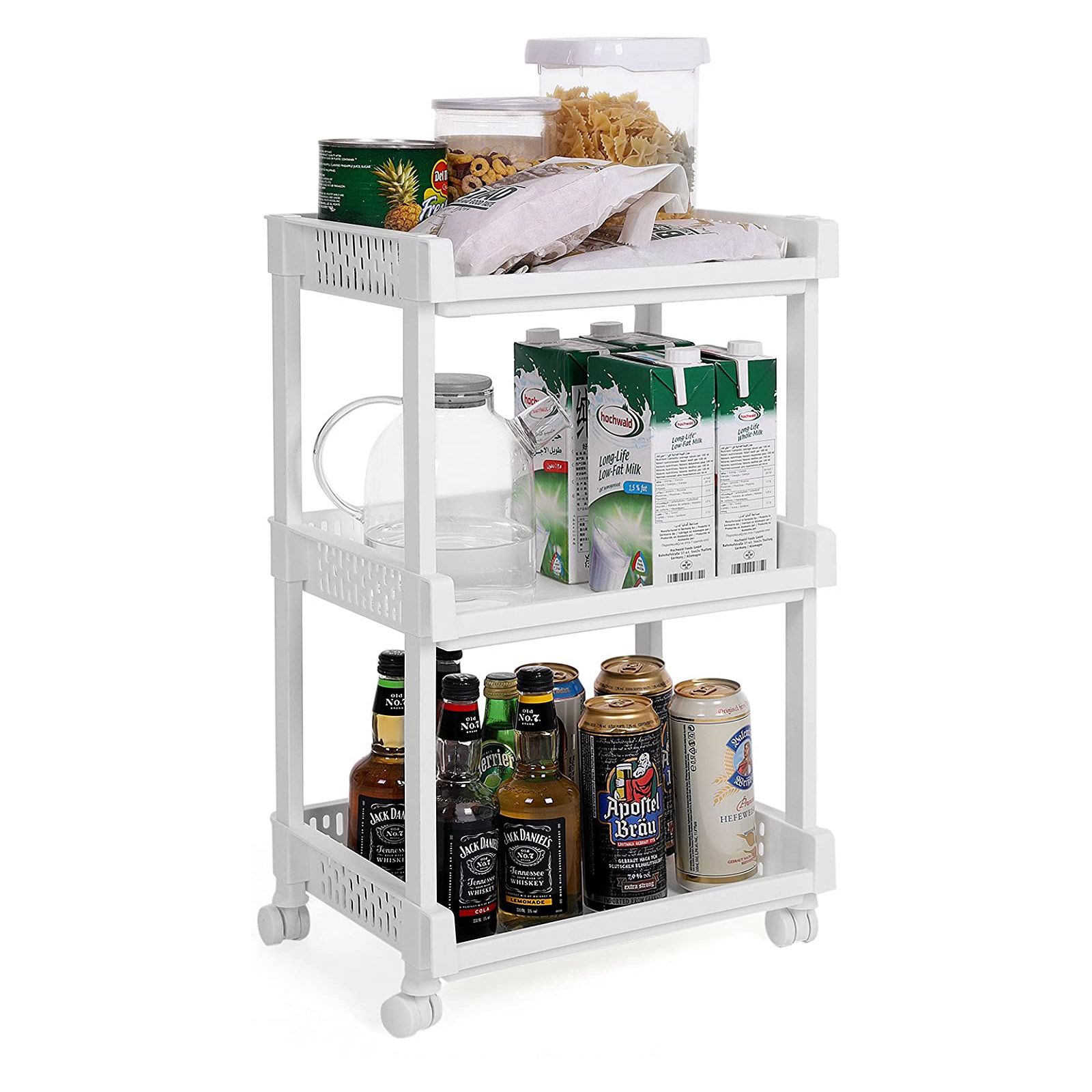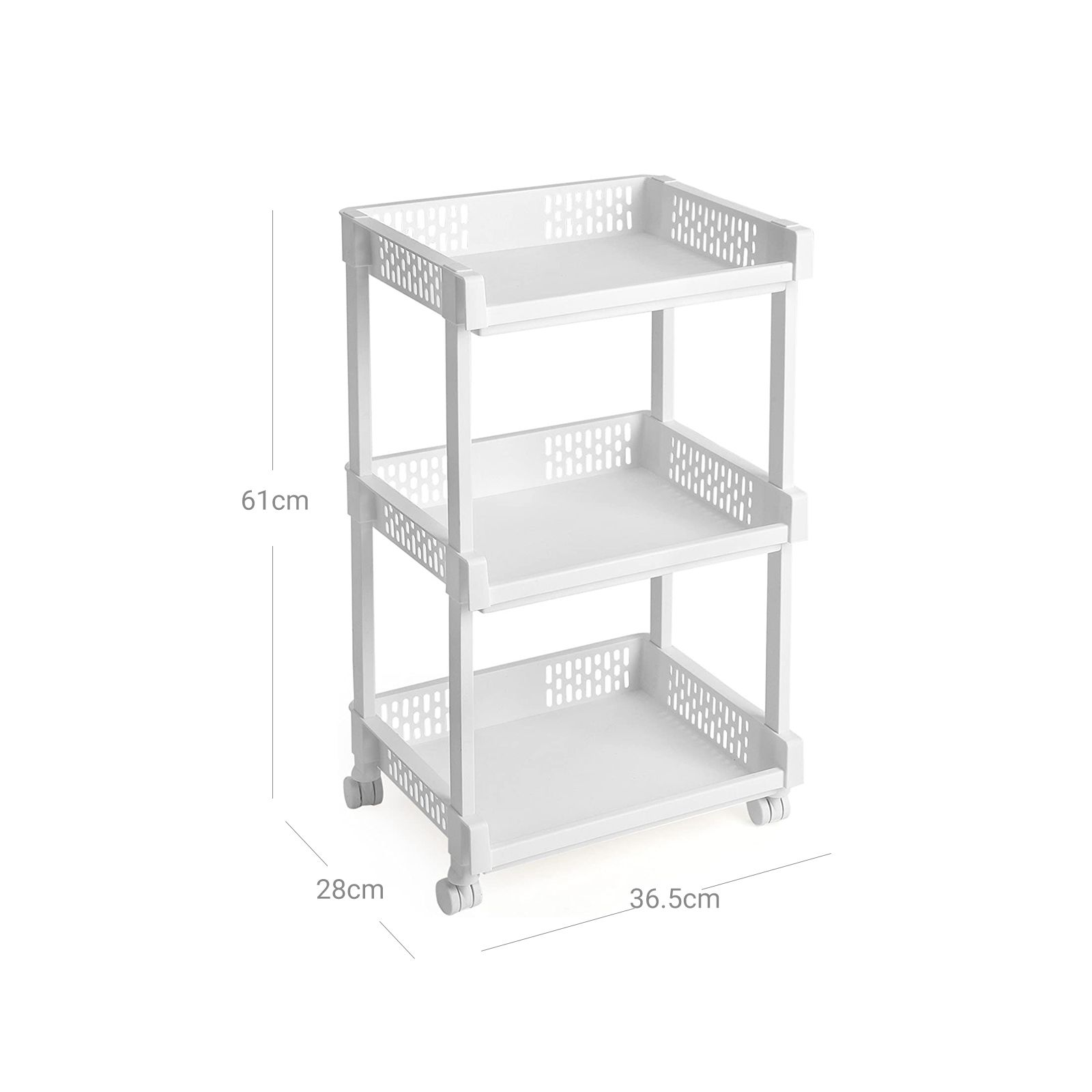 Spacious Storage Organiser: Large distances between shelves allow the organiser to accommodate even tall boxes of cereal and higher shower lotions.Durable Storage Rack: Robust PP plastic makes the storage rack durable for years to come. 36.5 x 28 x 61 cm, this trolley fits the bathroom, kitchen, bedroom and living room.Free Rolling Trolley: The trolley rolls fast and smoothly with light weight and 4 castors. It is easy to move from one place to another. Easy to assemble with simple structure.