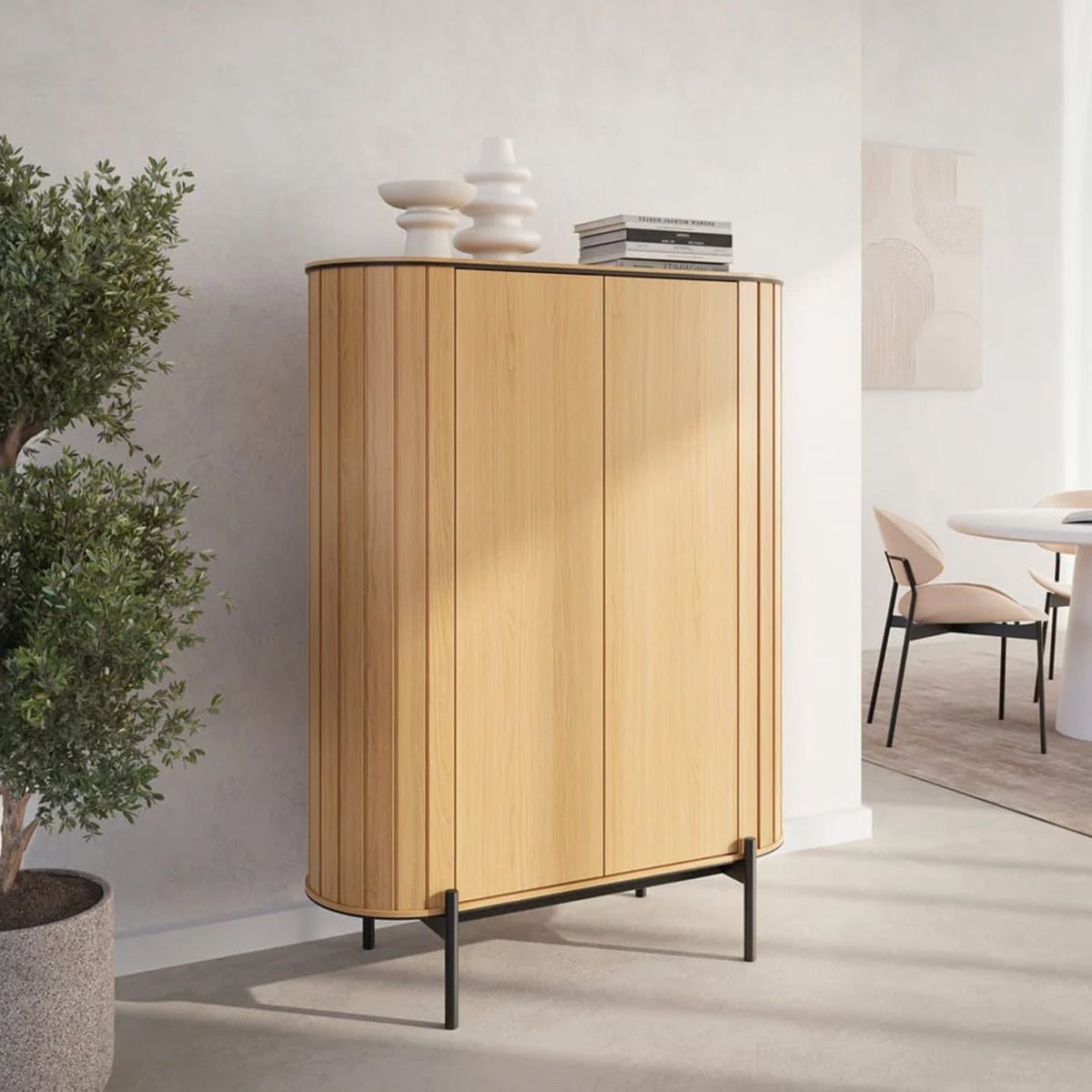 The ROTTORIA RT-01 Highboard Cabinet is a stylish and functional storage solution for dining rooms and living areas. Featuring two hinged doors and six shelves, it's perfect for storing dishes, glasses, and other essentials.
