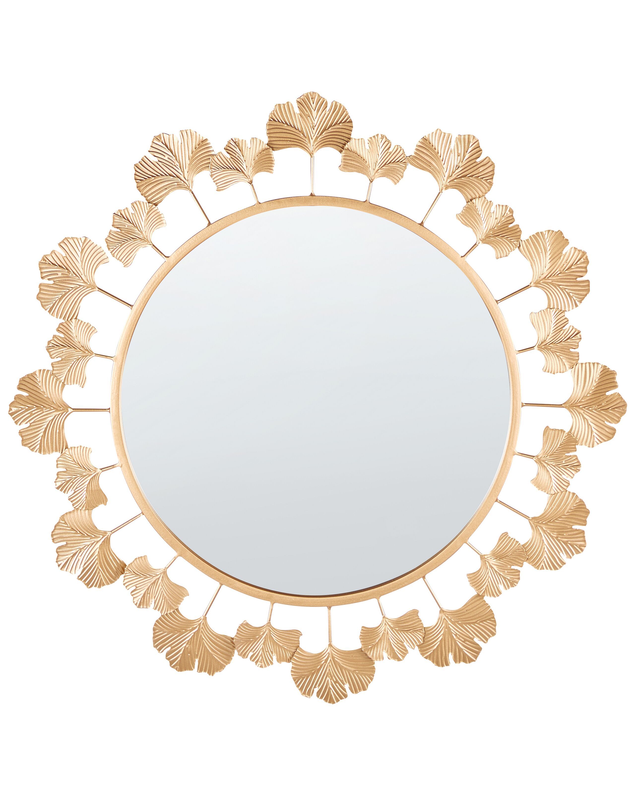 Step into the timeless allure of this unique mirror – a radiant masterpiece that transcends mere reflection. Embraced by a lustrous metal frame, every curve celebrates nature's elegance with attached delicate ginkgo biloba leaves. Elevate your surroundings with this symphony of form and function, where artistry and practicality converge in a golden embrace. Details: Color: Gold. Main material: Iron. Additional material: Glass, MDF. Weight: 2 Assembly: Does Not Require Assembly