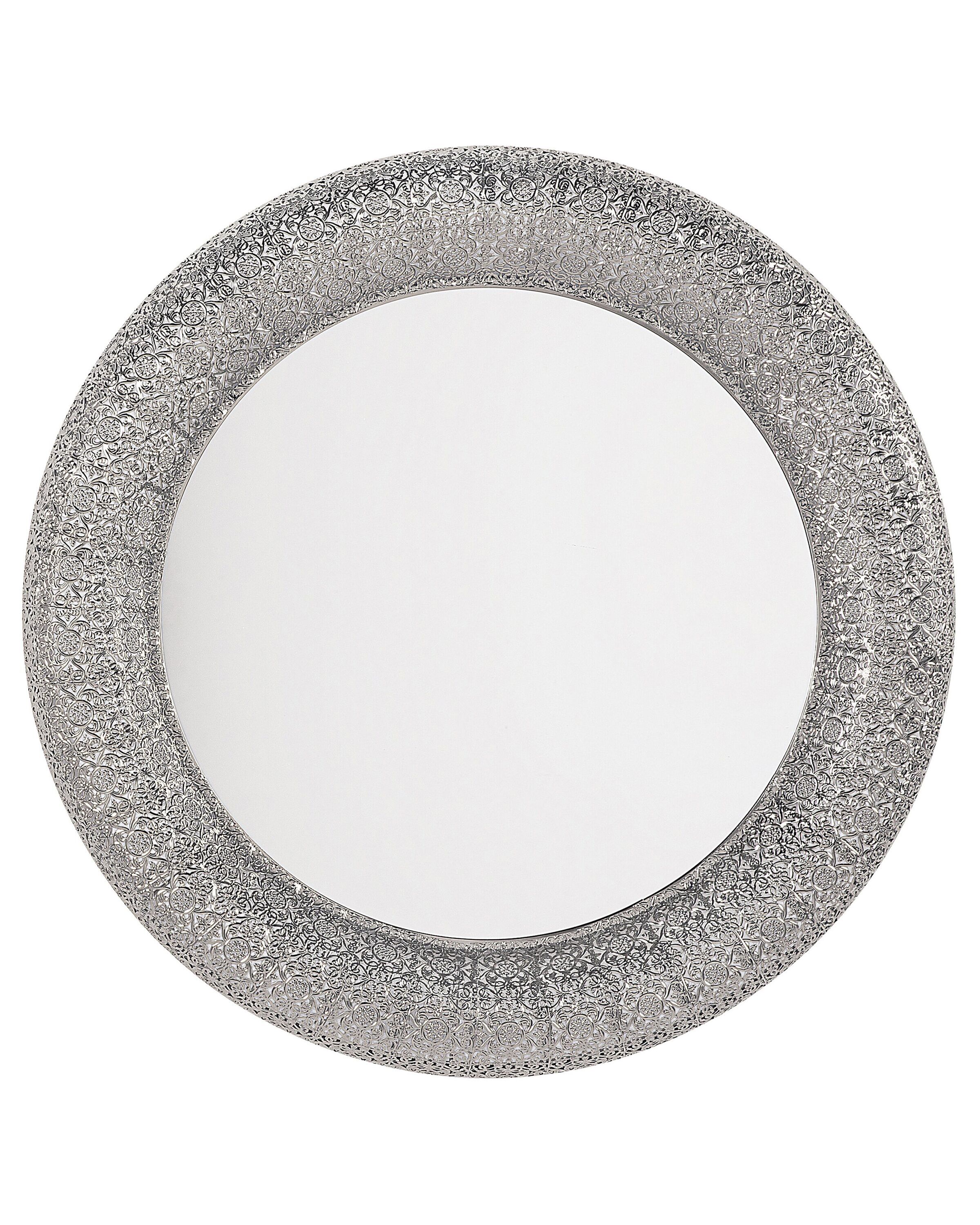 This wall mirror lends a luxurious feel to any small or large interior. Constructed with thick metal framing painted in silver, it works great hanging above a mantelpiece, opening up a narrow entryway or creating an eye-catching accent on an empty wall behind a sofa. With its round, textured design, the mirror is a perfect focal point for glam and vintage home décor. Details: Color: Silver. Main material: Metal. Additional material: Glass. Weight: 6 Assembly: Does Not Require Assembly