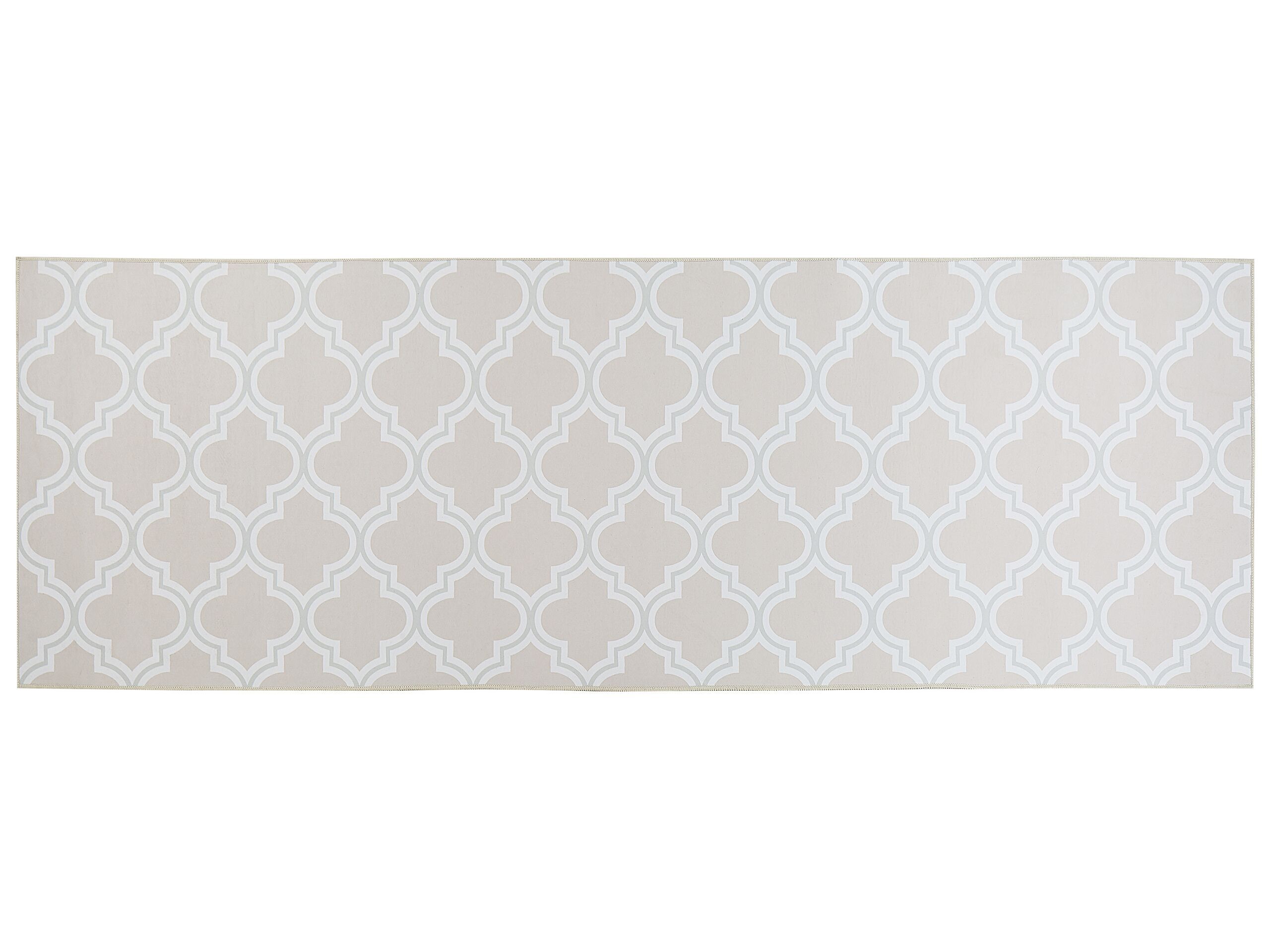 Decorate your hallway or bedroom with this rectangular, low pile runner rug. The piece is made out of polyester in beige colour, which makes it durable and easy to clean. It features a wonderful, attention drawing quatrefoil pattern, which gives the rug an oriental vibe. Details: Color: Beige, White. Main material: Polyester. Material Composition: 100% Polyester Weight: 1.4 Assembly: Does Not Require Assembly