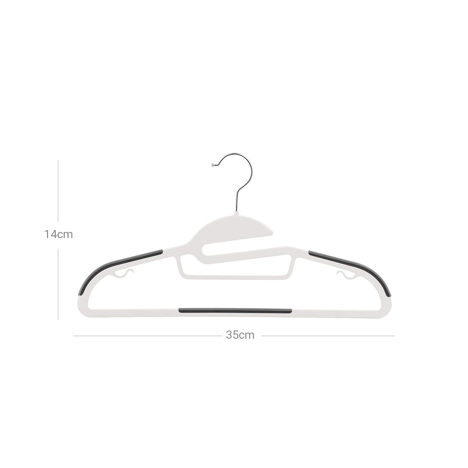 Flexible Coat Hangers for All Your Clothes: The hanger has 2 small hooks for strappy tops, bras, skirts, blouses, and trousers with loops. In addition, the hanger offers space for trousers to hang on the bottom bar and a smaller centre bar also offers space for scarves and ties.Non-Slip and Slim Design: Jackets, vests, and trousers can be hung securely due to a rubber coating on the shoulder area and the centre bar. The hangers are only 0.5 cm thick and take up so little space in the wardrobe. However, they are robust and do not break easily withstanding heavy items of clothing.More Space in the Wardrobe: With these hangers, you can hang jackets and trousers together on one hanger. An entire outfit can be combined on one coat hanger—saving space and time in the morning.