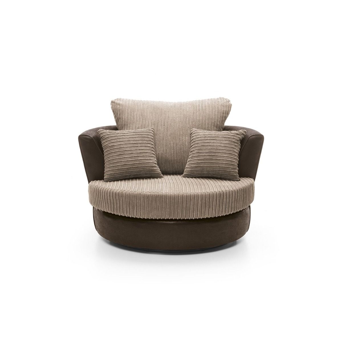 Looking for a grey or brown chenille swivel chair? The Sampson fits the bill, quite perfectly. Upholstery for this tub chair is a combination fabric that uses both cord chenille as well as faux suede. The hybrid fabric provides both luxurious feel and opulent aesthetics. A deep foam block seat, fibre filled back cushion and a couple of toss pillows provide all the comfort you need. A lounge chair available in both grey and brown.