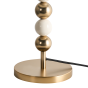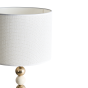 This table lamp combines modern glamour with timeless elegance, featuring a striking metallic base of stacked spheres. Its light-coloured drum shade provides soft, diffused light, creating a warm and inviting atmosphere. Perfect for a bedside table, side table, or home office desk, it brings a touch of sophistication to any space.