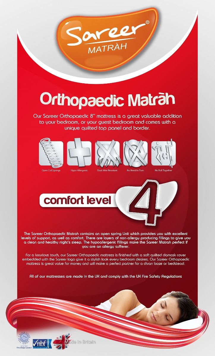 The Sareer Orthopaedic Matrah contains an open spring unit which provides you with excellent levels of support, as well as comfort. There are layers of non-allergy producing fillings to give you a clean and healthy night's sleep. The hypo allergenic fillings make the Sareer Matrah perfect if you are an allergy sufferer. For a luxurious touch, our Sareer Orthopaedic mattress is finished with a soft quilted damask cover embedded with the Sareer logo to give it a stylish look every bedroom desires. Our Sareer Orthopaedic mattress is great value for money and will make a perfect partner for a divan base or bedstead.