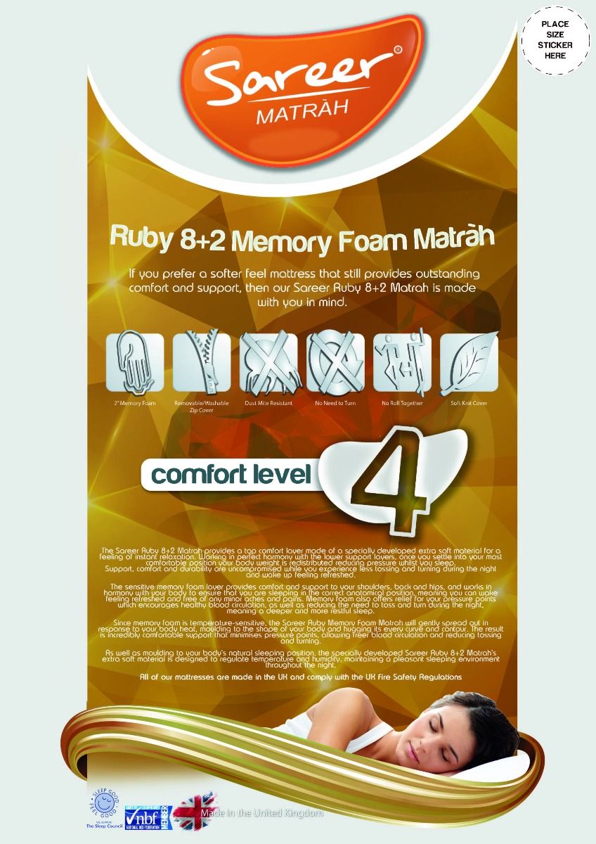 This is a mattress featuring layers of memory and reflex foam with a top layer of extra soft material for a more refreshing sleep. Memory and reflex foam layers. Extra soft top comfort layer Lower support layers Regulates temperature and humidity. Available in all sizes. Made of specially developed extra soft material, the top layer of the Sareer Matrah Ruby Memory Foam Mattress provides a feeling of instant relaxation. As well as moulding to your body's natural sleeping position, the extra soft material is designed to regulate temperature and humidity, maintaining a pleasant sleeping environment throughout the night.