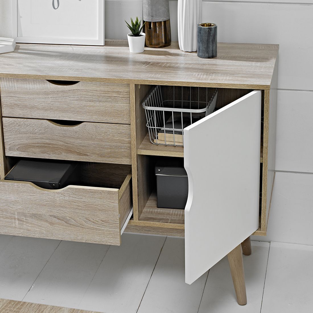 The Scandi range is an incredibly stylish and elegant collection of furniture, in a beautiful retro scandinavian style with multiple colour tones and sleek wood grains. Crafted from a solid oak wood frame with painted drawer fronts, available in white or grey able to suit your tastes. This large storage sideboard features 2 cupboard doors and 3 drawers providing plenty of storage space. Arrives flat packed for self assembly.
