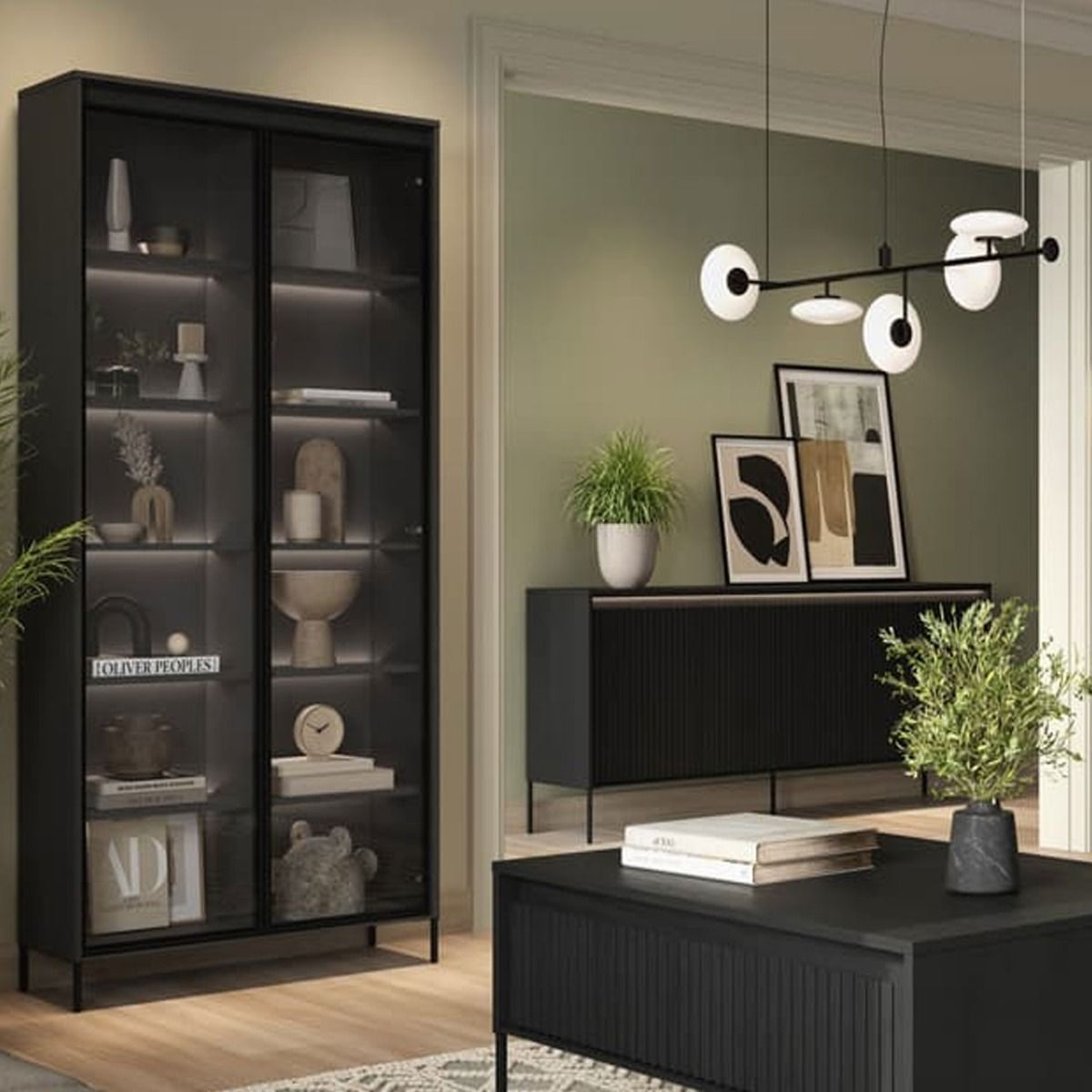 Introducing the Scribble Spex Tall Display Cabinet, a chic and contemporary addition to your space. With two partially glassed hinged doors and a sleek push-to-open system, this cabinet seamlessly combines style and functionality. Boasting ten shelves, it offers ample space to showcase your treasures or organize your essentials. The modern touch of black metal legs adds a sophisticated flair, while the high-quality 16mm laminated board construction ensures durability. Assembly is required for a personalized touch, making this cabinet the perfect showcase for your unique style.