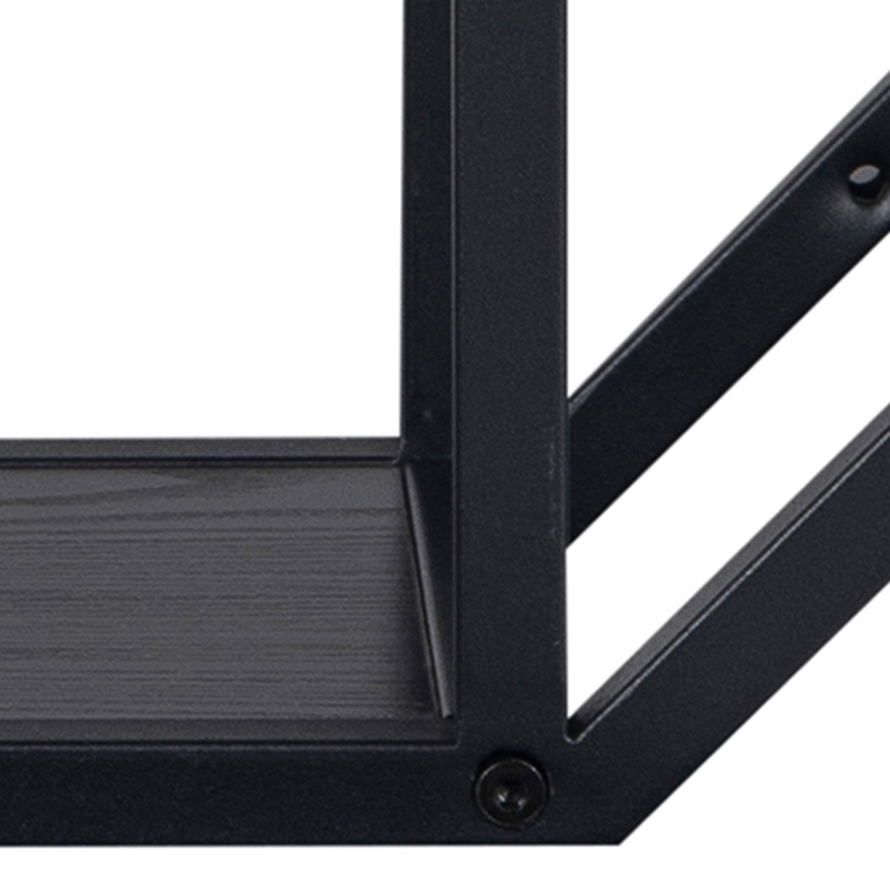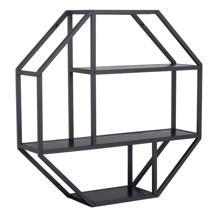 Add a modern twist to your walls with this octagonal wall shelf, featuring a matte black steel frame and four ash black shelves. Its asymmetrical design is both eye-catching and functional, perfect for displaying your favorite items.