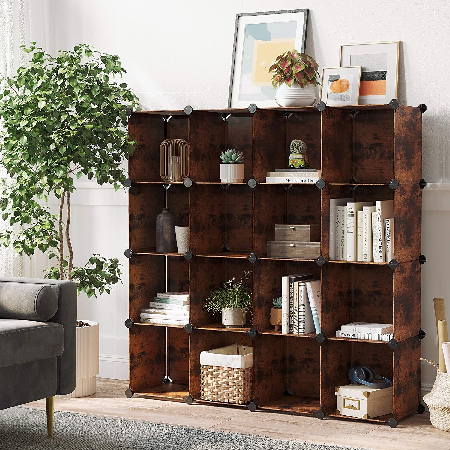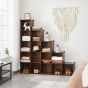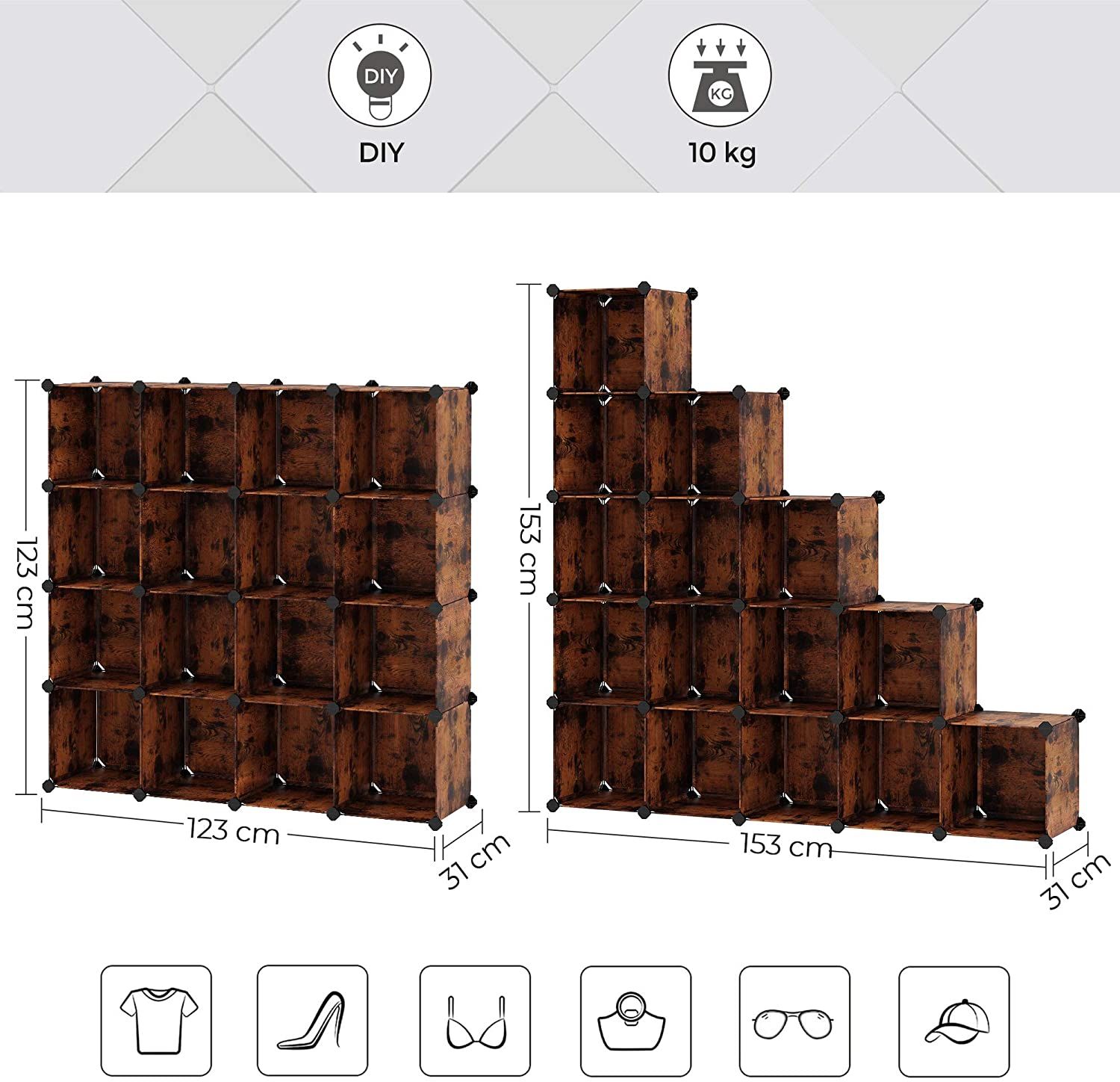 Simple Plug-In DesignThis set consists of a total of 56 plastic panels with an integrated metal frame and 52 ABS plastic connectors. A small mallet is also included. With the help of these components, this shelf can be quickly assembled by sliding the rustic brown panels into the connectors and tapping them with the mallet. Finally, you can attach the resulting piece of furniture to your wall with the anti-tipping hardware. This Is How It Works- Assemble the shelf in steps and place it under your stairs in the hallway to store shoes and bags.- Place the shelving unit upright in your bedroom and use it as a wardrobe.- Divide the 16 cubes and place 3 small shelves in rooms with limited space. For example, place a 6-cube shelf in your bathroom to keep all your hygiene items tidy.- Use the shelving system to build a spacious playpen for hamsters, guinea pigs, bunnies, and more.