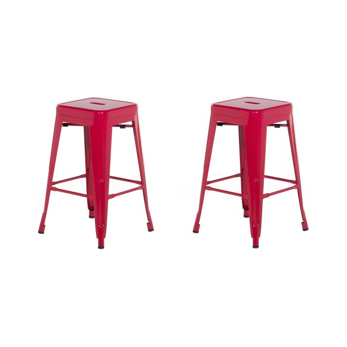 Comfortable, practical and on-trend - this set of 2 red bar stools is a perfect addition to a dining room in industrial and modern decor. The loft-inspired design is combined with functionality, such as stackable feature that makes them easy to pair with any kind of kitchen set-up, and can also be used in the bathroom, office or garage. Stools are made of powder-coated Steel with leg pads to protect your floor and provide a non-slip stand. The cross beams on all four sides can also serve as comfortable footrests. Details: Color: Red. Main material: Steel. Weight: 5 Assembly: Does Not Require Assembly Weight Capacity: 200 Seat Height: 60