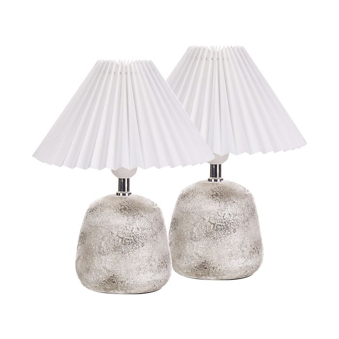 This set of 2 ceramic table lamps is perfect for creating an intimate and cosy ambiance at home. Designed with a raw-look concrete effect base, it brings in rustic charm, making it ideal for bedside tables or hallway corners that need additional light. Completed with a pleated synthetic shade, it is an elegant lighting solution for a modern home. Details: Color: White, Grey. Main material: Ceramic. Additional material: Synthetic Material. Weight: 1 Assembly: Partial Assembly Required