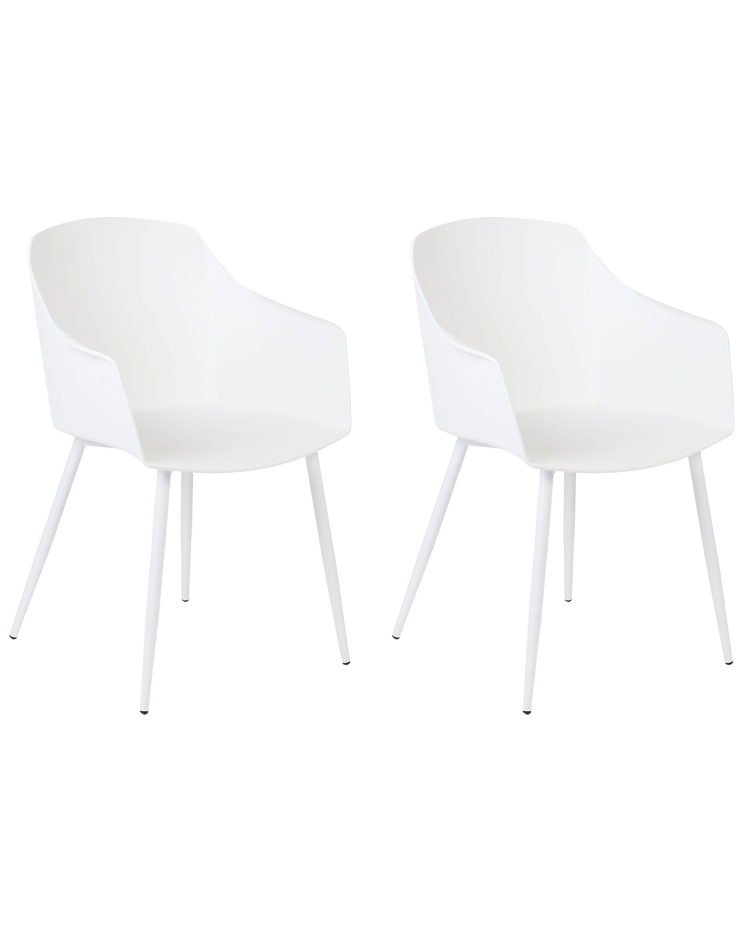Refresh your dining area with this set of chairs. Made out of durable and low-maintenance synthetic material, they're a perfect addition to any kitchen or living room, as they can be cleaned easily and quickly. The wide seat, high back and armrests ensure comfortable seating, while white metal legs guarantee the stability of the whole construction. Due to their minimalist design, they can be placed in various settings and decor styles, starting from modern and contemporary all the way to retro and vintage-inspired rooms. Details: Color: White. Main material: Synthetic Material. Additional material: Metal. Weight: 6 Assembly: Legs to be Fitted Weight Capacity: 150 Seat Height: 44