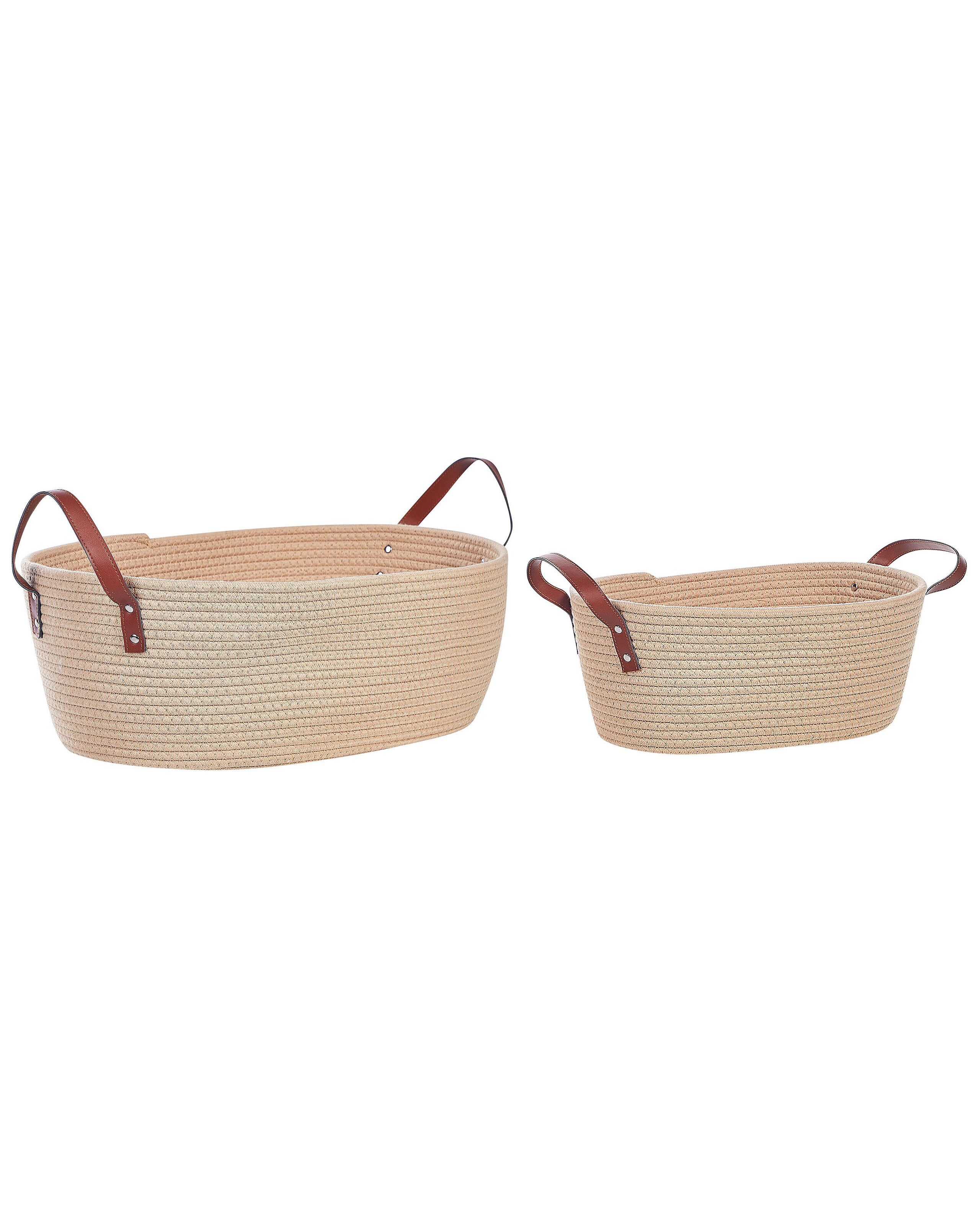 Keep your home tidy and your belongings organised with this set of two baskets. Handmade from a cotton rope for durability, they come in different sizes, allowing you to store both small and large accessories. The practical handles make it convenient to carry the baskets along with their contents. Details: Color: Beige, Brown. Main material: Cotton. Additional material: Faux Leather. Material Composition: 100% Cotton Weight: 1.3 Assembly: Does Not Require Assembly Overall Dimensions: 50x36x19