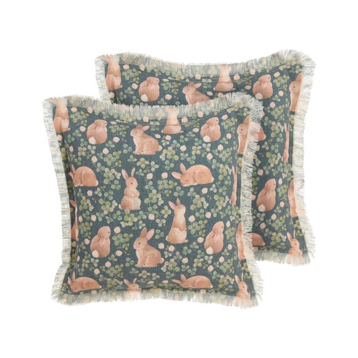 Unleash whimsical charm with this set of 2 exceptional scatter cushions. Crafted from a durable blend of polyester and cotton, they offer easy maintenance with their inbuilt zipper. The playful rabbit print and decorative fringes add a touch of enchantment to your decor. Bring joy and style into your space today. Details: Color: Green, Beige. Main material: Cotton. Material Composition: 50% Polyester, 50% Cotton Assembly: Does Not Require Assembly