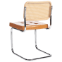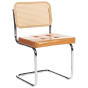 These mid-century modern cantilever chairs boast a sleek, glossy metallic frame that effortlessly supports the faux leather seat in a golden brown hue. The chairs are accentuated by a distinctive Viennese braid backrest, adding a touch of elegance to their design. This captivating combination of materials and style creates a timeless piece that will elevate any interior space.