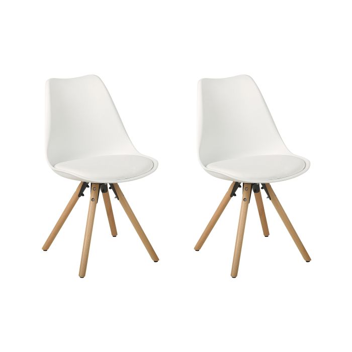 Minimalistic yet classy dining chair set is a great addition to your home interior, fitting any contemporary decor. Constructed using quality synthetic fabrics, the chair is easy-care and retains an elegant look even after prolonged usage. Beechwood legs guarantee exceptional durability while accenting the seat perfectly. Faux leather seat is both sophisticated looking and provides absolute seating comfort. Details: Color: White, Light Wood. Main material: Synthetic Material. Additional material: Faux Leather, Beechwood. Material Composition: 100% PU Leather Weight: 5 Assembly: Legs to be Fitted Wood type: Fagus Sylvatica Wood Origin: China Weight Capacity: 110 Seat Height: 46