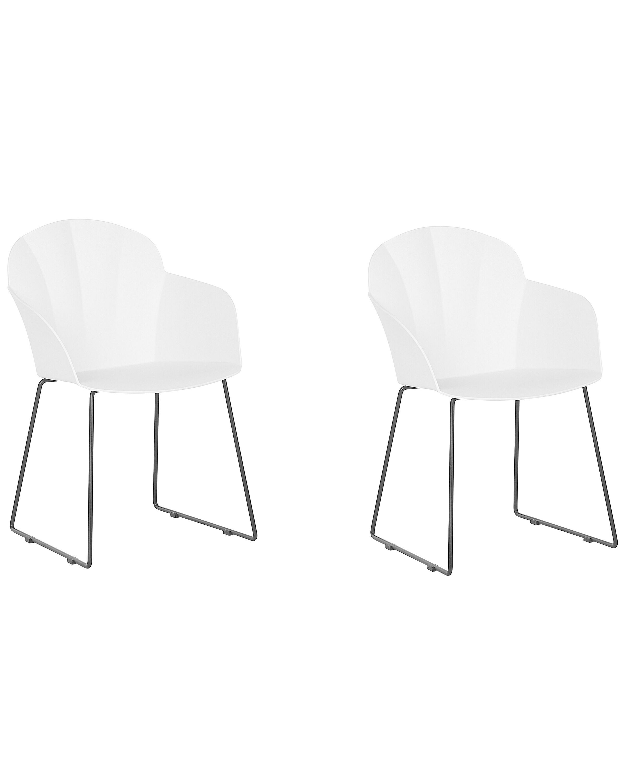 Dining chairs should first and foremost be comfortable, but practicality should closely follow. This set of dining chairs made of synthetic material fulfils both conditions. The durable seat is built on top of metal legs, granting superior stability. The back is decoratively sculpted and the chairs look exceptionally modern. Details: Color: White, Black. Main material: Synthetic Material. Additional material: Metal. Weight: 8 Assembly: Legs to be Fitted Weight Capacity: 120 Seat Height: 46