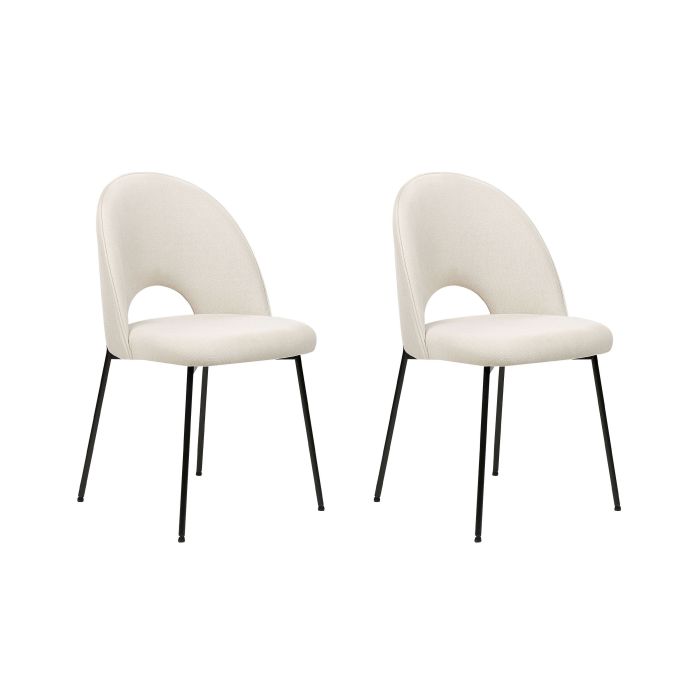 Introduce a retro vibe to your interior with this set of stylish chairs. Thickly padded and upholstered in pleasant to touch polyester fabric, they feature four thick black metal legs that add character to any dining set set-up. Combined with a streamlined backrest with a decorative gap, it underlines both modern and traditional arrangements. Details: Color: Beige, Black. Main material: Polyester. Additional material: Metal. Material Composition: 100% Polyester Weight: 6 Assembly: Partial Assembly Required Weight Capacity: 120 Padding Thickness: 5 Seat Height: 48