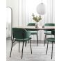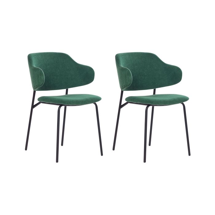 Set of two dining chairs which make a perfect addition to your dining table, offering both style and comfort. With its armless design, it takes up minimal space, making it ideal for cosy dining areas. The gently curved backrest provides ergonomic support while adding a touch of sophistication to your space. Its simple yet sturdy metal legs ensure durability, and the soft, pleasant upholstery invites you to relax and enjoy your meals in a stylish interior. Details: Color: Green, Black. Main material: Polyester. Additional material: Iron, Plywood, Poplar Wood. Material Composition: 100% Polyester Weight: 6 Assembly: Partial Assembly Required Wood type: Populus Wood Origin: China Weight Capacity: 120 Seat Height: 48