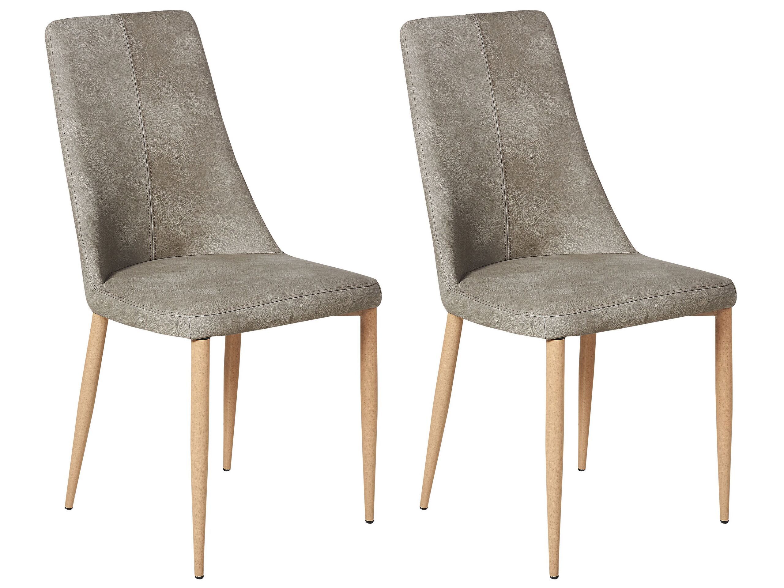 This set of two chairs adds a modern touch to any kitchen or dining room. The faux leather upholstery, neat seams, and sleek metal legs in a light wood shade, make the set elegant in its simplicity. Thanks to the high, slightly rounded backrests and soft padded seats, the chairs provide perfect sitting comfort. Details: Color: Grey, Light Wood. Main material: Faux Leather. Additional material: Steel, Plywood, Foam. Material Composition: 100% PU Leather Weight: 5 Assembly: Legs to be Fitted Weight Capacity: 120 Seat Height: 43