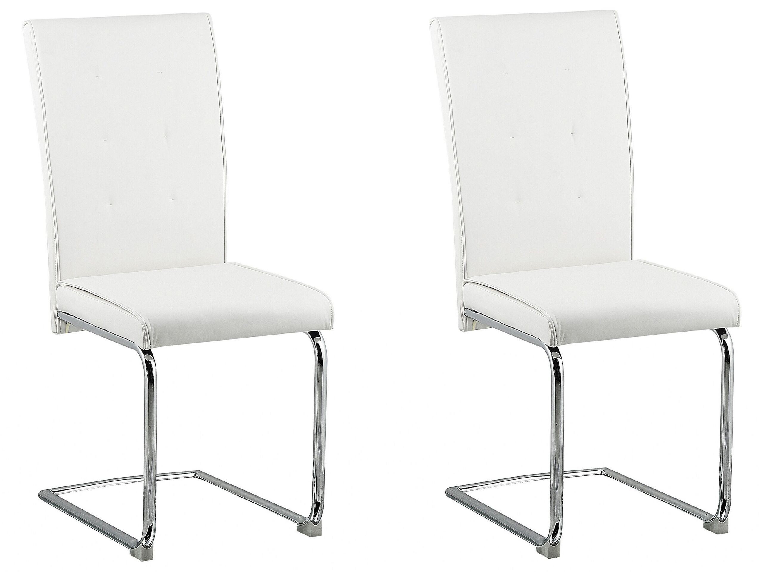 The cantilever chairs bring in a retro feel to any interior. The upholstery is made from a faux leather upholstery, which is both durable and stylish. The cantilever frame is equipped with leg caps to protect your floor from scratching. Thanks to their timeless design the chairs will fit just right into any dining room. This set will provide comfortable seating for your guests. Details: Color: White, Silver. Main material: Faux Leather. Additional material: Metal. Material Composition: 100% PU Leather Weight: 8 Assembly: Full Assembly Required Weight Capacity: 150 Padding Thickness: 7 Seat Height: 51