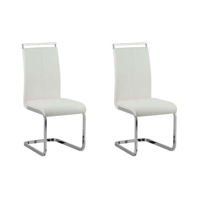 This set of 2 elegant chairs in a sleek shape will perfectly match any modern or retro interior design. The cantilever base made of chromed metal provides stability, while the thickly padded back and seat guarantee the highest comfort. Thanks to the white faux leather upholstery the piece is not only easy to maintain but also durable. The design of the chairs makes them an excellent choice for your dining room as well as for a conference room. Details: Color: White, Silver. Main material: Faux Leather. Additional material: Metal. Material Composition: 100% PU Leather Weight: 7 Assembly: Full Assembly Required Weight Capacity: 150 Padding Thickness: 6 Seat Height: 47