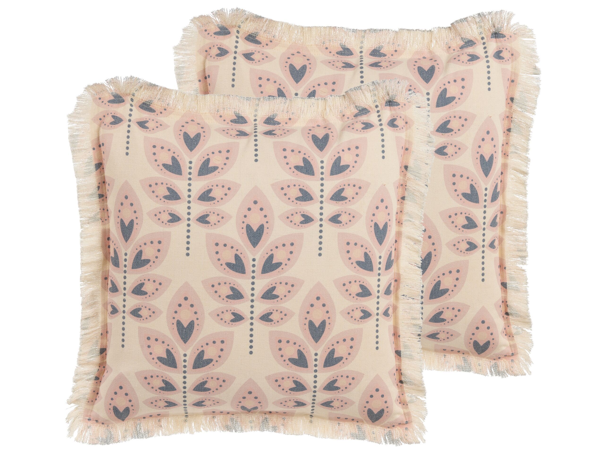 Complete your space with this minimalist set of 2 scatter cushions. Crafted from a durable blend of polyester and cotton with linen-like finish, its inbuilt zippers make it both stylish and convenient. The interesting leaf pattern and charming fringes add a touch of nature-inspired beauty to your decor. Upgrade your comfort and style effortlessly. Details: Color: Beige, Grey, Pink. Main material: Polyester. Material Composition: 50% Polyester, 50% Cotton Assembly: Does Not Require Assembly