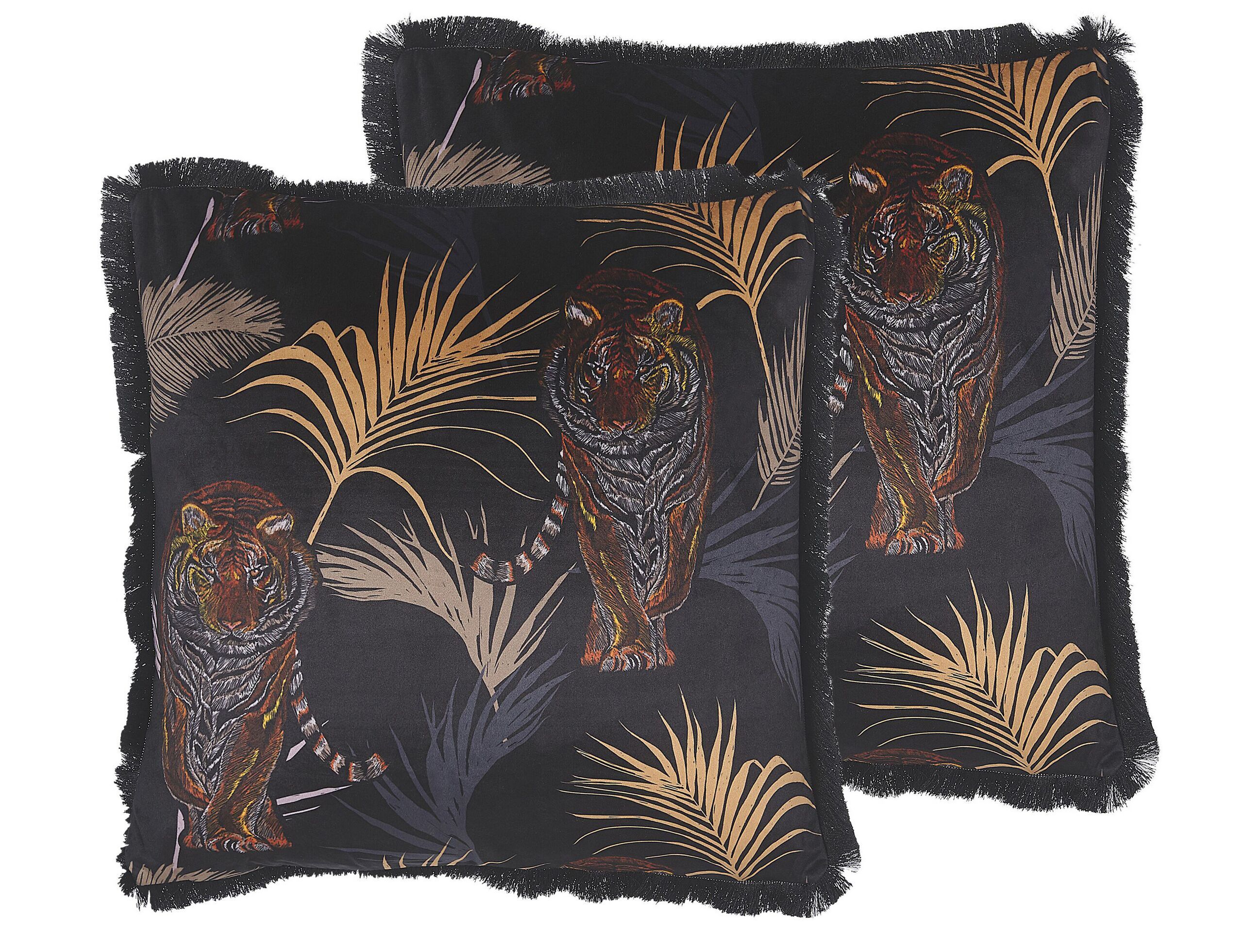 Set of 2 Fringed Cushions Tiger Motif 45x45cm Black