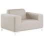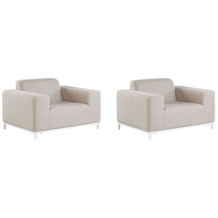 This set of 2 armchairs looks lovely in a garden or on a patio but it can also be a perfect addition to your indoor living space. The piece has fitted, wide armrests providing comfortable sitting, while also featuring slightly inclined backrest and deep shape. Beige upholstery is made of a durable polyester fabric, which is perfect for outdoor use, due to its water resistance and being permeable. Modern look and trendy colour make this armchair set a great addition to any modern area. Details: Color: Beige, White. Main material: Polyester. Additional material: Aluminium, Quick Dry Foam. Material Composition: 100% Polyester Weight: 16 Assembly: Legs to be Fitted Weight Capacity: 150 Seat Height: 38
