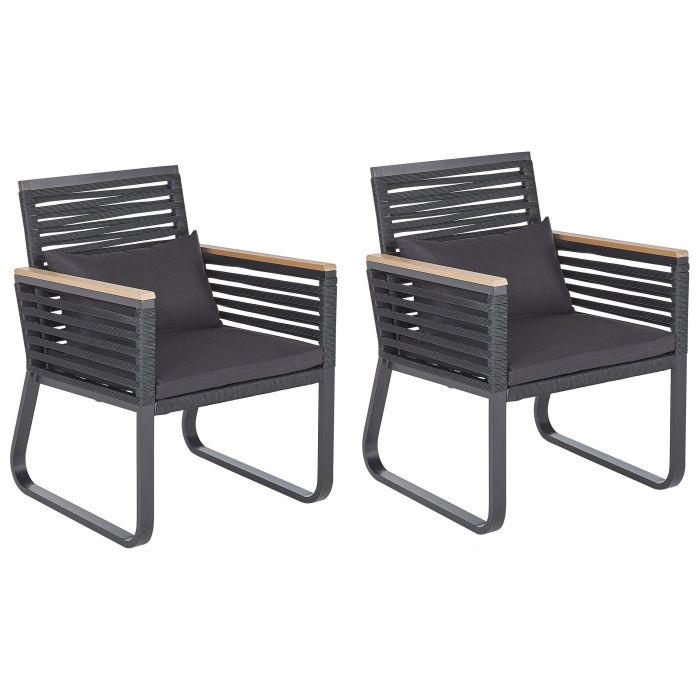 This set of two modern chairs will perfectly complement any outdoor area. Robust and durable construction made from aluminium provides stability, whilst plastic wood elements on the armrests add cosiness. Comfort is guaranteed thanks to the rope-styled backrests and seats, coupled with the generously padded cushioning. Use them independently or with a stylish table to create an inviting outdoor dining area in your garden. Details: Color: Black, Light Wood. Main material: Aluminium. Additional material: Polyester, Plastic Wood. Material Composition: 100% Polyester Weight: 7 Assembly: Full Assembly Required Weight Capacity: 130 Padding Thickness: 3 Seat Height: 45