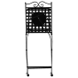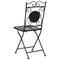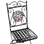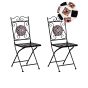 Enhance your outdoor area with this decorative set of 2 foldable garden chairs, crafted from sturdy metal. The backrest showcases an intricate mosaic design, featuring tiny black and gold tiles that exude vintage charm. Ideal for cosy outdoor settings, its retro style seamlessly complements any patio or garden. Designed with protective leg caps, this elegant chair set ensures your surfaces stay scratch-free, offering both style and practicality in a single, convenient piece.