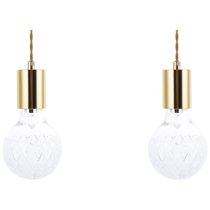 Minimalist and elegant, these pendant lamps are all about subtle beauty. They add style to any living room, bedroom, dining room or office. The frame is made of metal with a trendy, reflective golden finish, complemented by the unique woven cord. The glass shades perfectly imitate the shape of a large designer light bulb. Their transparency allows creating a bright spotlight perfect for work, while the carvings are accentuated with the gentle play of light and shadow. Details: Color: Gold, Transparent. Main material: Glass. Additional material: Metal. Weight: 1 Assembly: Requires Installation
