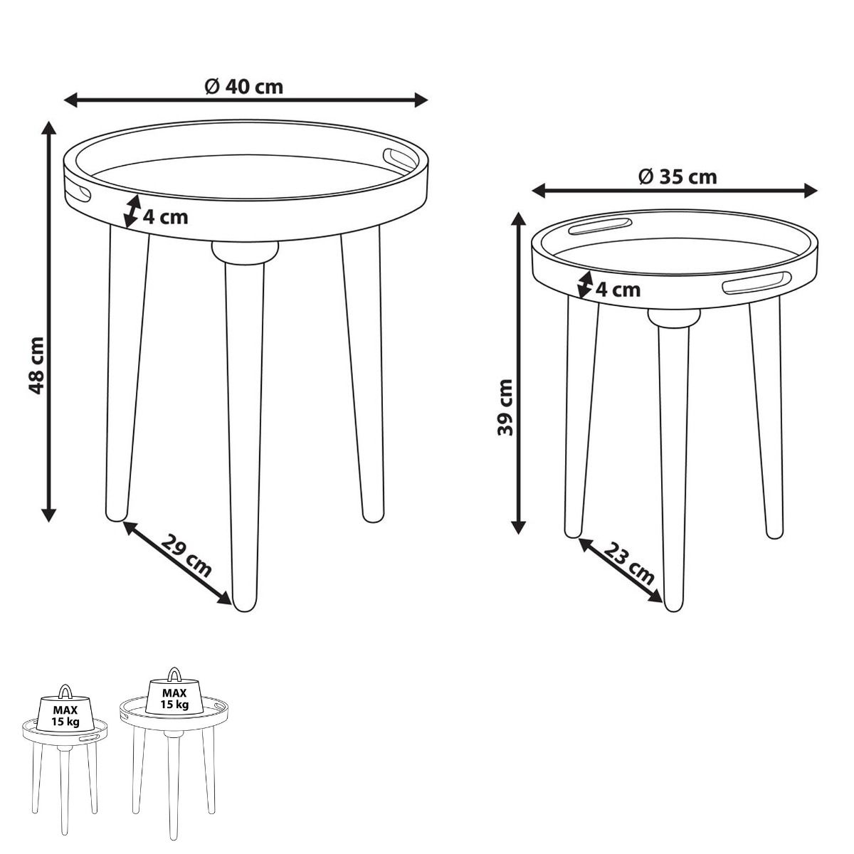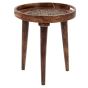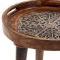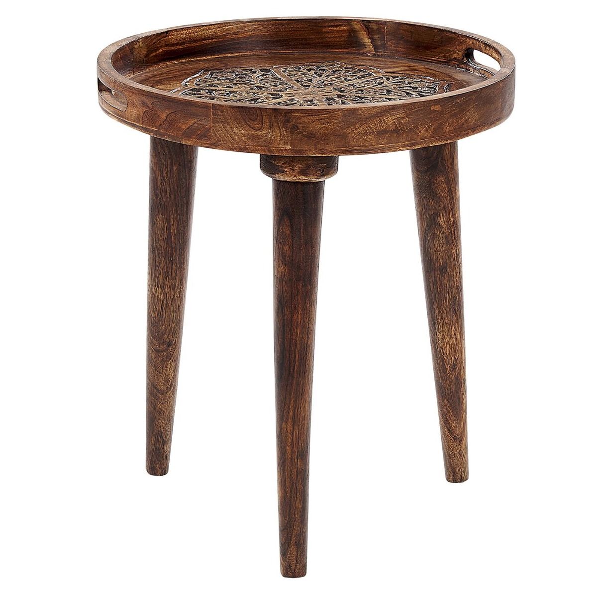 Get enchanted by this set of two handmade side tables with a beautifully carved floral pattern. The wooden top features practical handles that make it easy to move from one place to another. The side tables will be a great addition to the living room and bedroom, perfectly matching traditional and rustic interiors. Details: Color: Dark Wood. Main material: Mango Wood. Additional material: Mango Wood. Weight: 4 Assembly: Legs to be Fitted Wood type: Mangifera indica Wood Origin: India Weight Capacity: 15 Overall Dimensions: 40x40x48