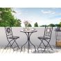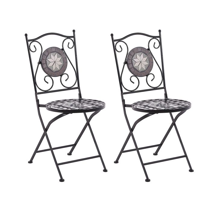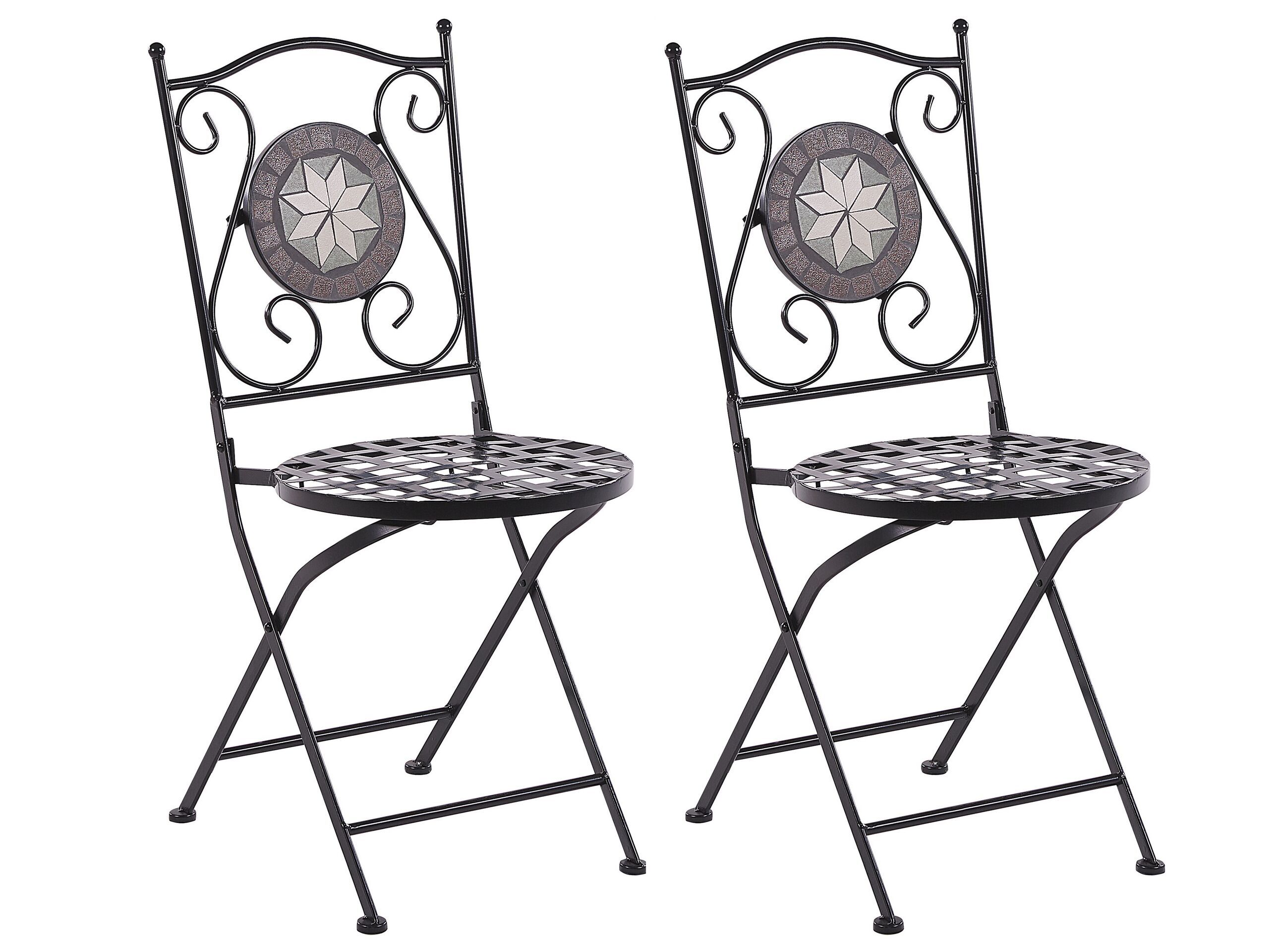 Enjoy a cup of tea in the sun with this charming outdoor chairs set. Perfect for small and large spaces, it features carved backrests and an intriguing mosaic pattern made out of ceramic tiles. Style the chairs in your backyard or balcony to create a cosy nook where you can relax. Made from metal the seats won’t be harmed by rain and thanks to the folding feature they are super easy to store. Details: Color: Black. Main material: Iron. Additional material: Ceramic. Weight: 7 Assembly: Does Not Require Assembly Weight Capacity: 120 Seat Height: 45