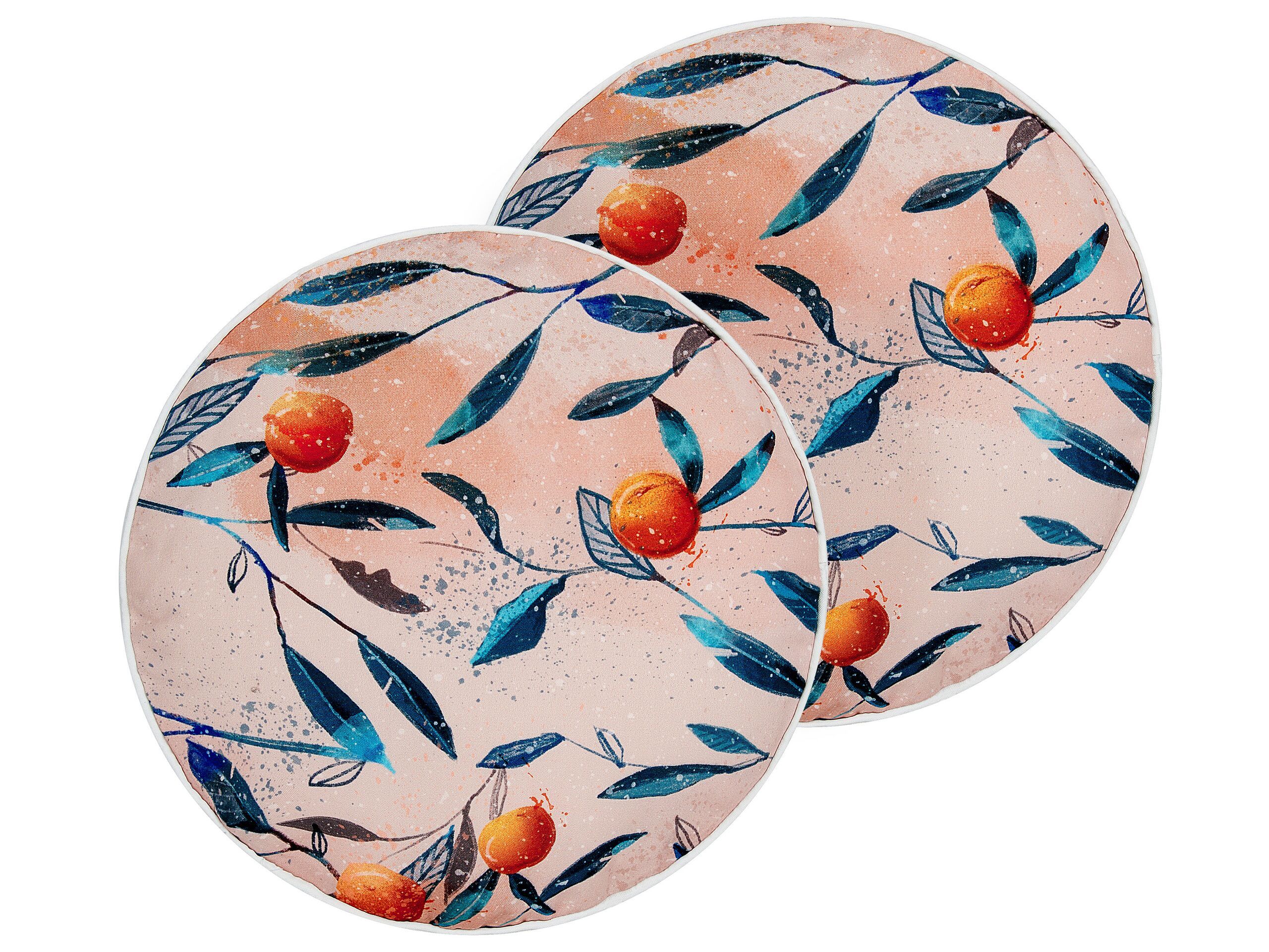 Make this outdoor moments even more enjoyable with this set of two stylish cushions. Their water-repellent covers boast a breezy leaves and nectarines pattern, giving your outdoor space a relaxed charm. For any modern garden or balcony, this soft accessory will bring both functionality and style. Details: Color: Multicolour, Orange. Main material: Polyester. Material Composition: 100% Polyester