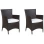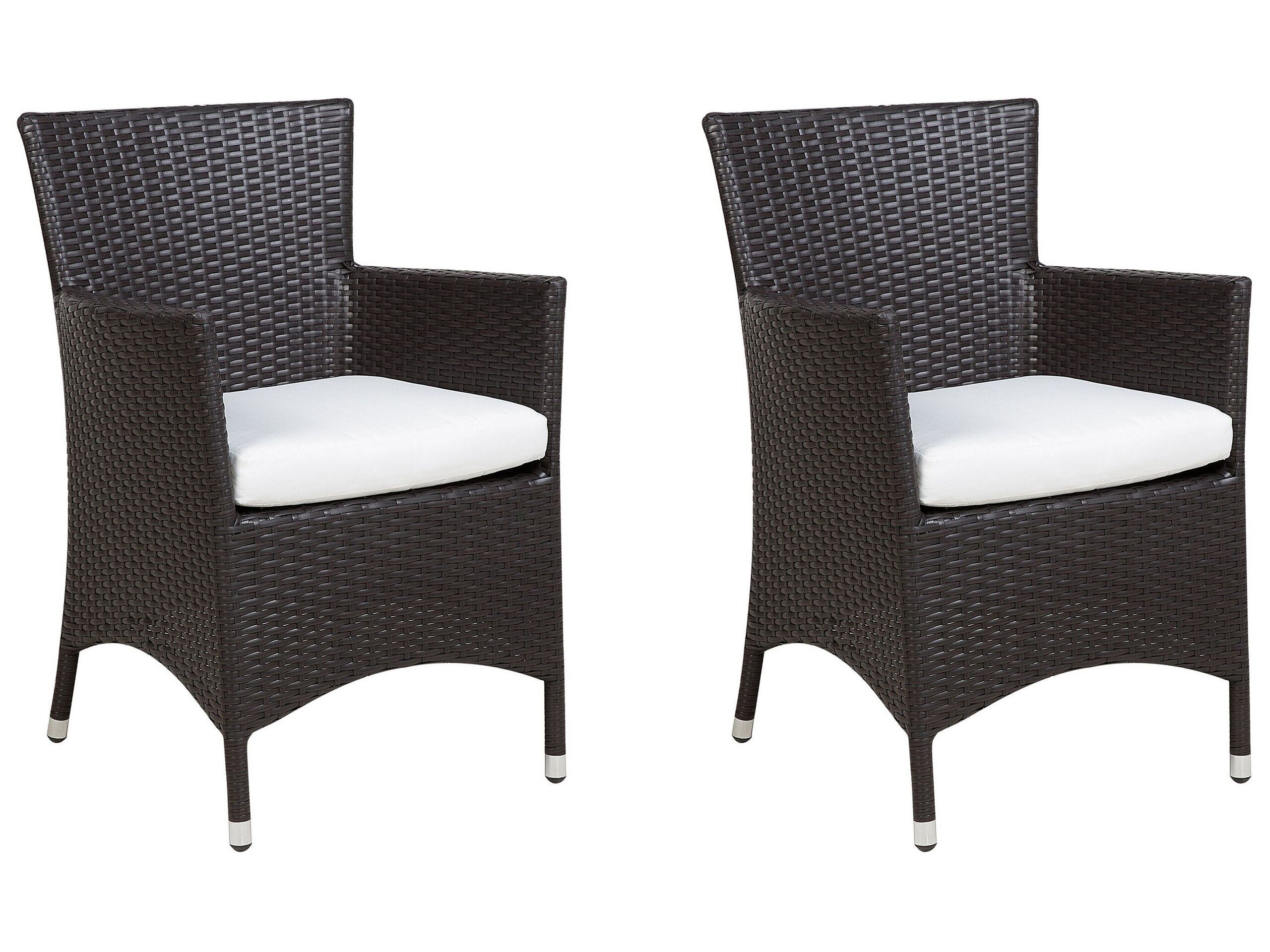A set of two stylish garden armchairs with ergonomic armrests and nicely shaped, high backrest. Made of brown durable synthetic rattan for long-term use, the set comes with thick cushions equipped with a removable cover for easy cleaning. The powder-coated aluminium frame guarantees maximum stability. Separately or together with a matching table, it will serve as an excellent place to enjoy the outdoors. Details: Color: Brown, White. Main material: PE Rattan. Additional material: Polyester, Aluminium. Material Composition: 100% Polyester Weight: 7 Assembly: Does Not Require Assembly Weight Capacity: 140 Cushions Dimensions: 45x40 Padding Thickness: 11 Seat Height: 41