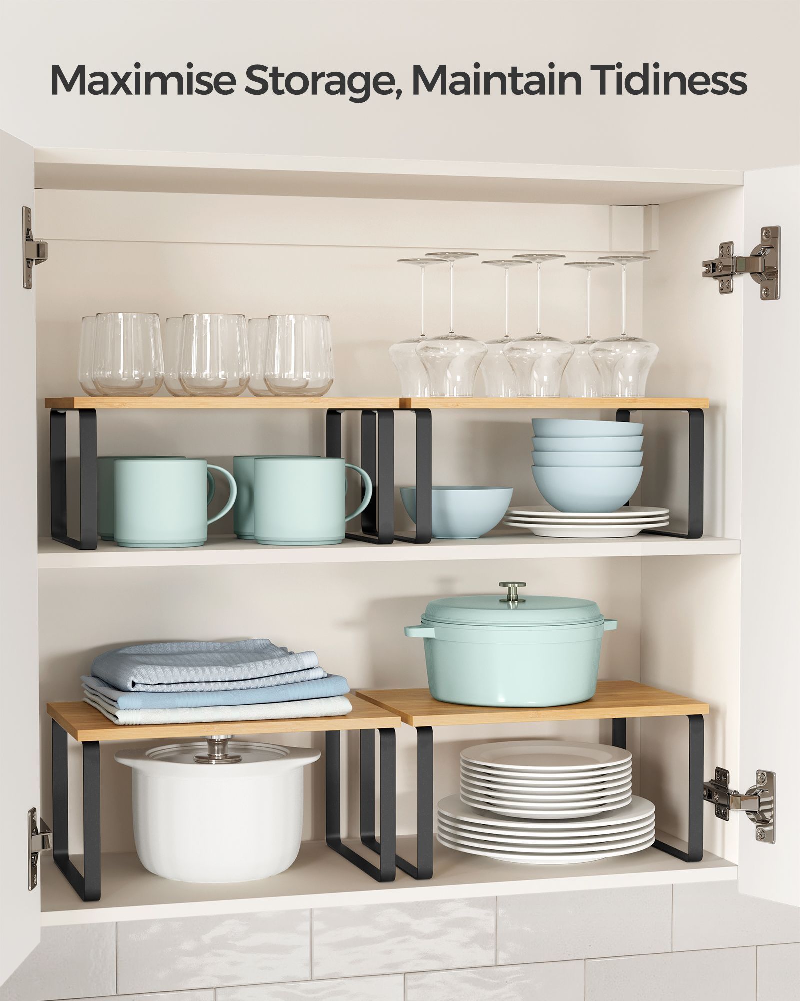 Organize your kitchen with this set of two stackable spice racks. Designed to maximize space, these racks can be stacked on top of each other or used separately to accommodate your spice collection. With a sturdy construction and compact design, they fit neatly in cabinets or on countertops. Keep your spices easily accessible and neatly arranged with this versatile and convenient set of stackable spice racks.