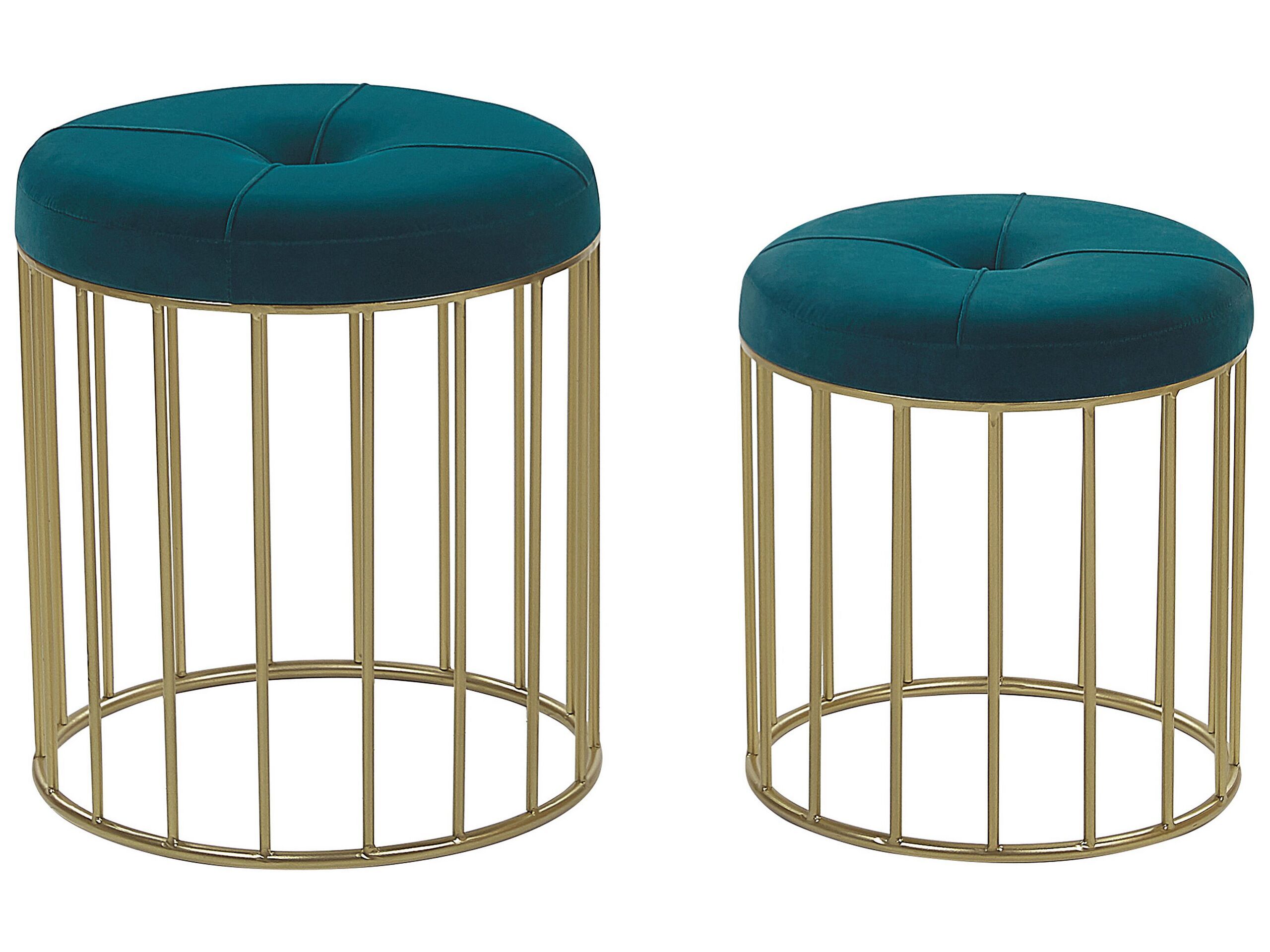 If you're looking for a way to modernise and refresh your living room or bedroom, this set of 2 nesting pouffes is exactly what you need. Their seats are made of velvet in a teal blue colour, which is complemented by a golden base. The smaller stool can go underneath the bigger one, saving you space when only one pouffe is needed. The top of each stool is tufted with a button, which additionally enriches the whole design. Details: Color: Blue, Gold. Main material: Velvet. Additional material: Nonwoven Fabric, Iron, Plywood. Material Composition: 100% Polyester Weight: 5 Assembly: Does Not Require Assembly Weight Capacity: 100